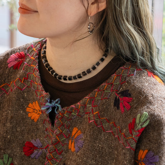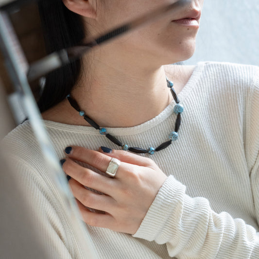 Melanie Decourcey Ebony wood with blue vintage ceramic beads snd small onyx