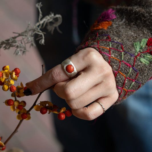 Melanie Decourcey Silver ring with dot texture and round coral center