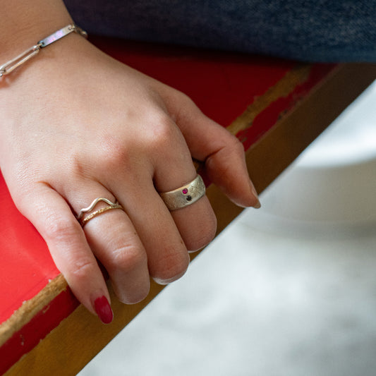 Melanie Decourcey Silver ring with XXX texture and ruby/black diamond