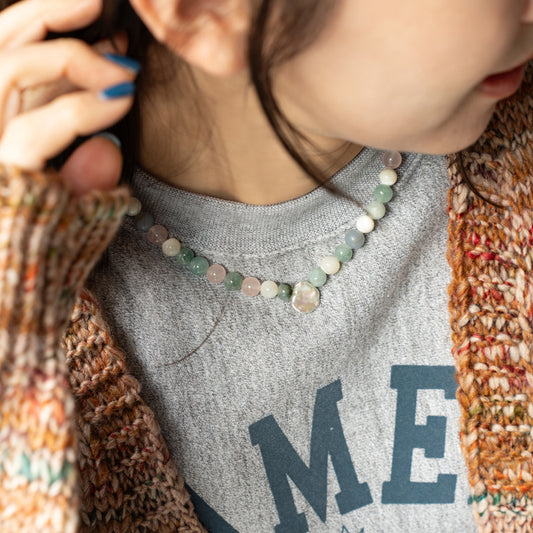 Melanie DeCourcey Mother of pearl, rose quartz, angelite, aventurine, pearl