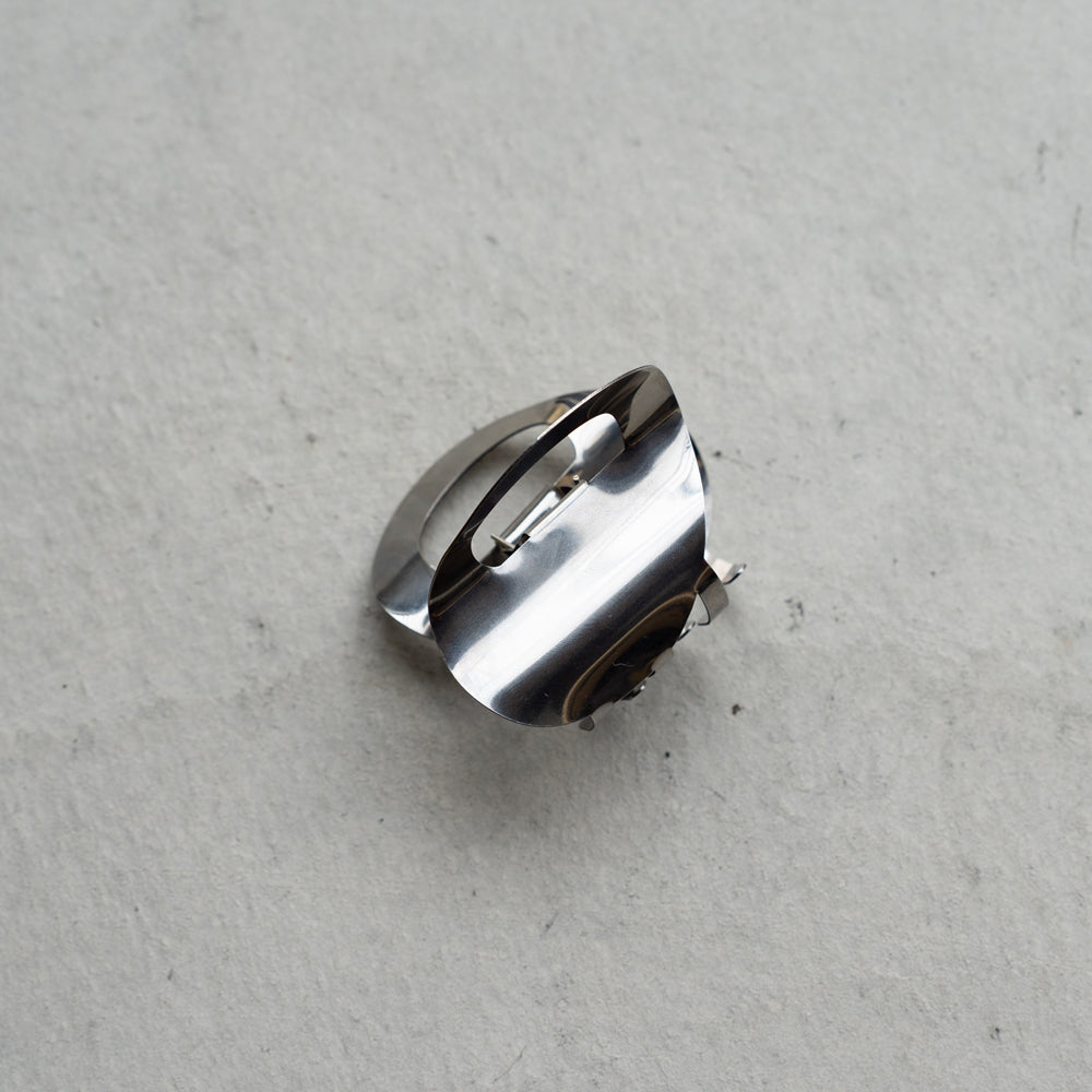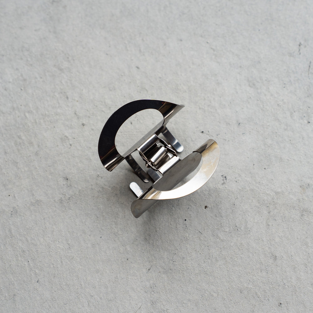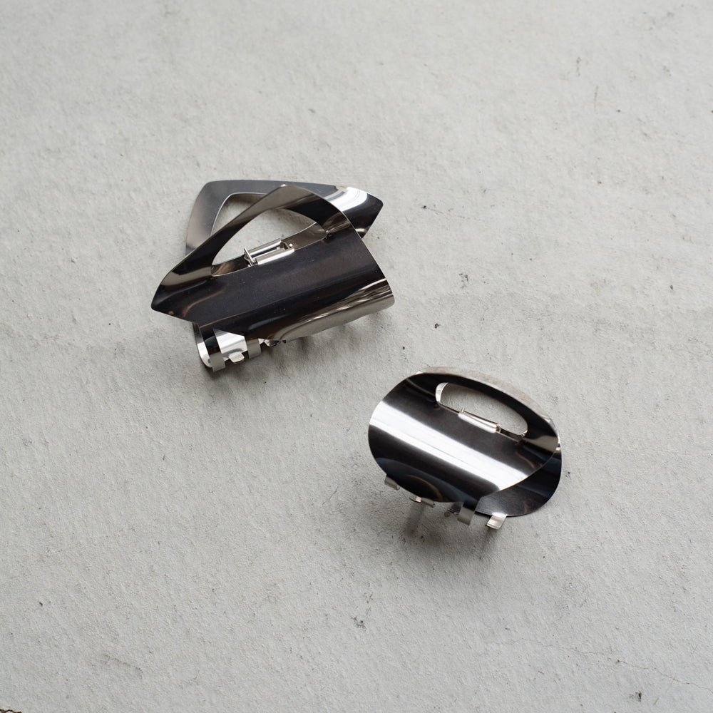 鏡のような美しい光沢と金属の持つシャープな質感がモダンな雰囲気のヘアクリップ。ネジをわずに折り紙や洋服のパターン工法を応用したシームレスなデザインです。洗練された雰囲気で綺麗めからカジュアルなお洋服まで幅広く合わせていただけます。