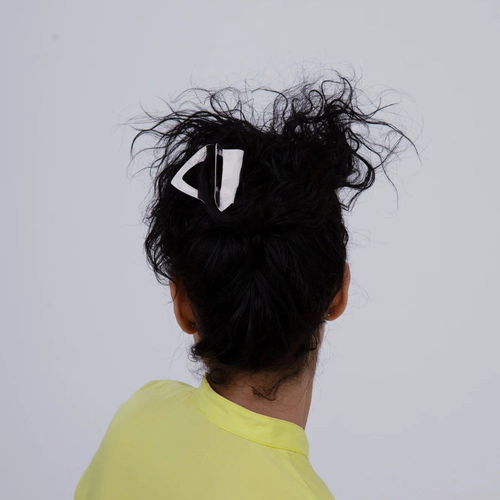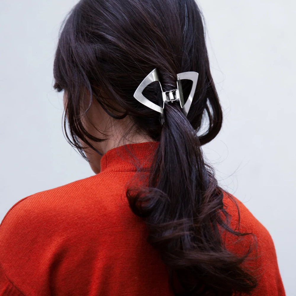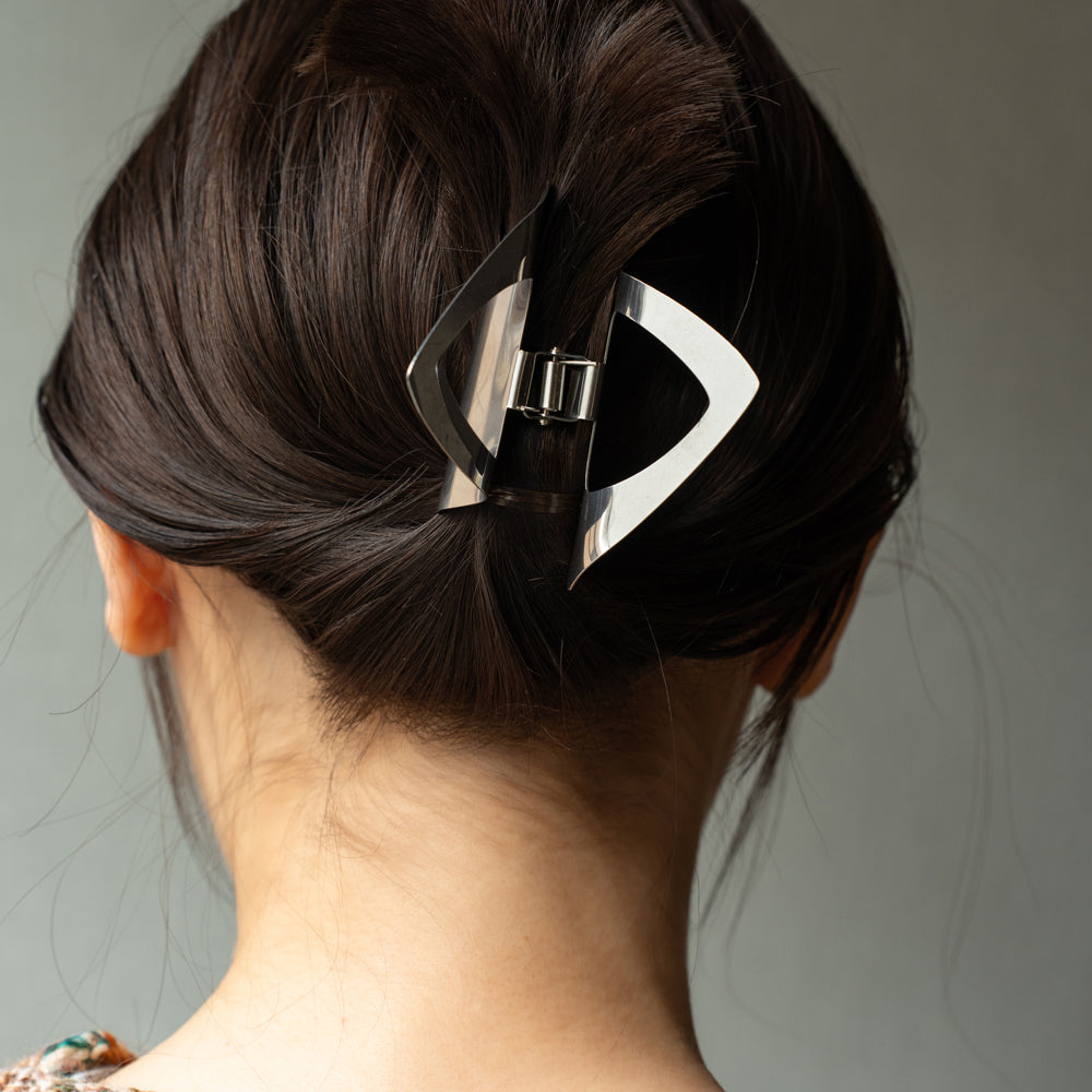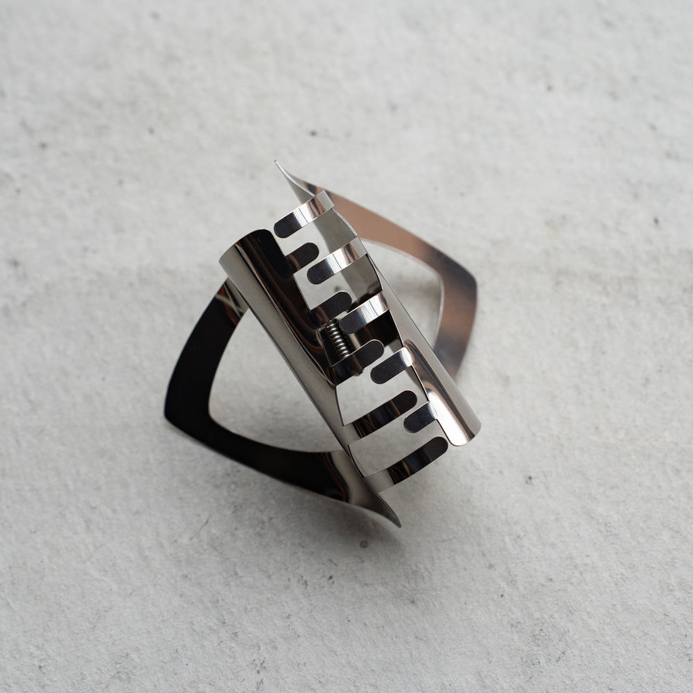 鏡のような美しい光沢と金属の持つシャープな質感がモダンな雰囲気のヘアクリップ。ネジをわずに折り紙や洋服のパターン工法を応用したシームレスなデザインです。洗練された雰囲気で綺麗めからカジュアルなお洋服まで幅広く合わせていただけます。