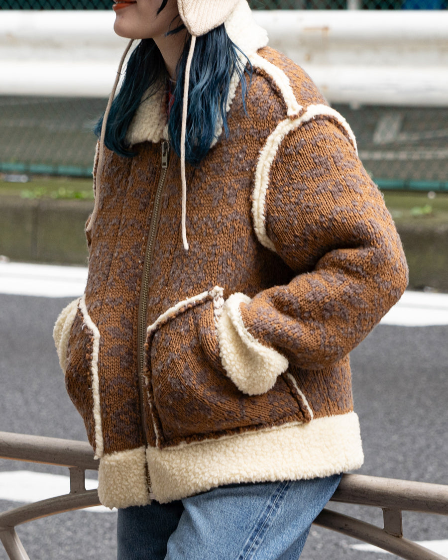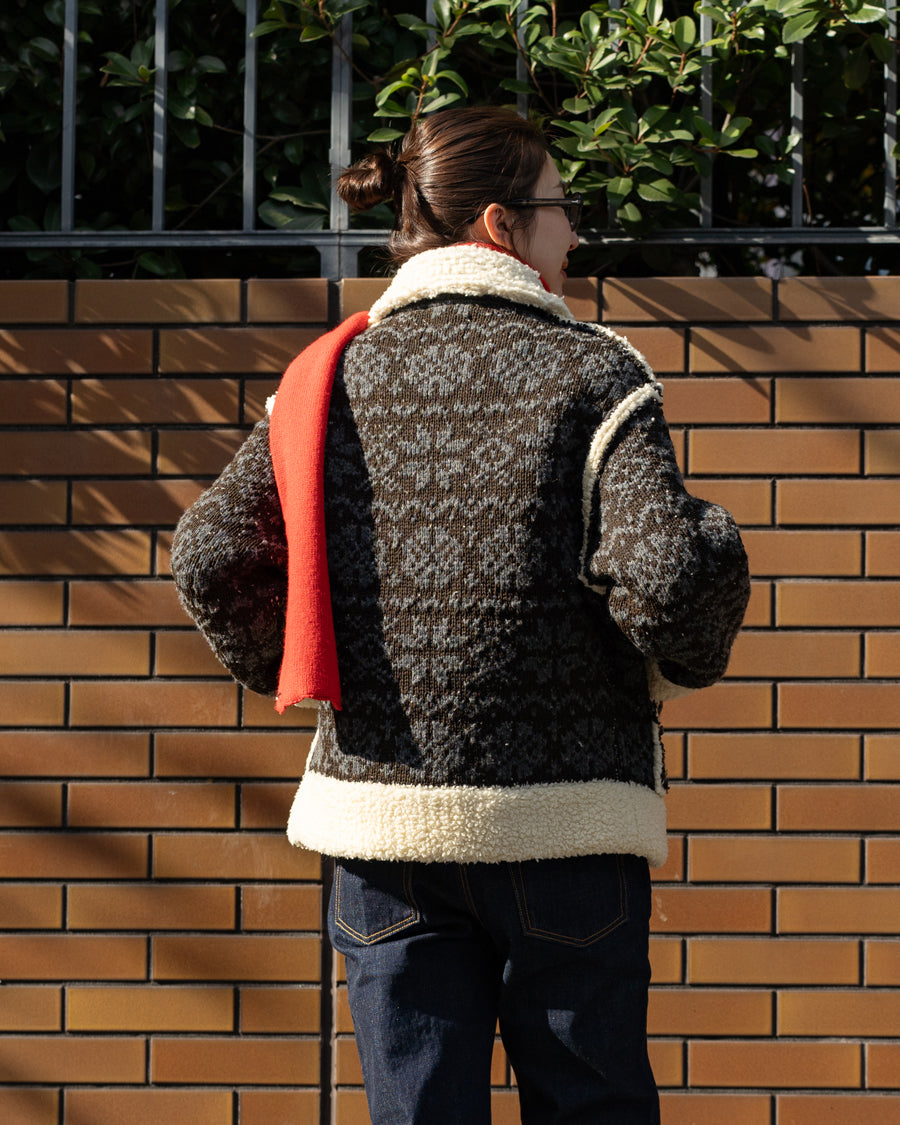 フェアアイルニットとムートンジャケットを融合したデザインのブルゾンです。表側はジャガードバターン、内側は柔らかなタッチのウールモールの2重構造です。もっちりとした肉感がありながら、柔らかな生地です。リアルムートンのような暖かさと、リアルにはない軽やかな着心地が特徴です。メンズサイズなので腕周りや身幅がゆったりとしたサイズ感。少し厚手のニットやスウェットを着込むこともできて、しっかりと防寒することができます。