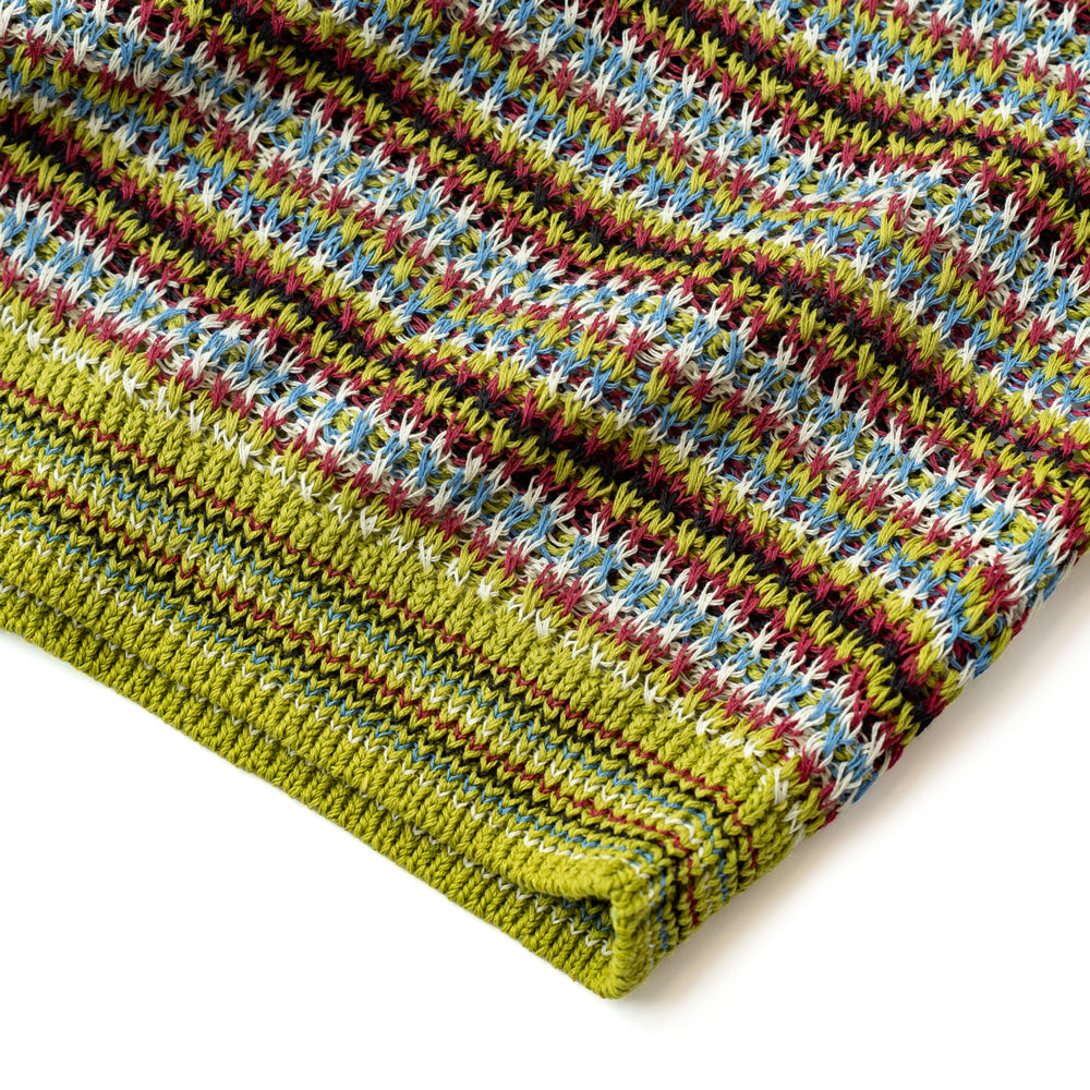 複雑なボーダーが特徴のニットベスト。ドライなタッチでシャリ感のあるコットンを使用しています。ややコンパクトなシルエットで太めのパンツと相性良し!夏場はノースリーブでさらっと着たいですね。
