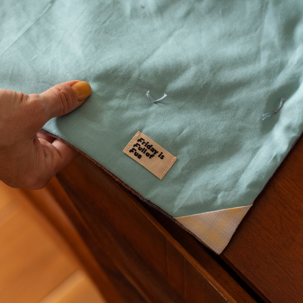 FFFやBLUE LUG製品などの余り生地を利用して製作したオリジナルデザインのキルト。