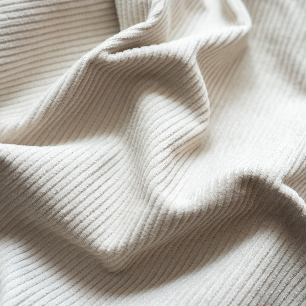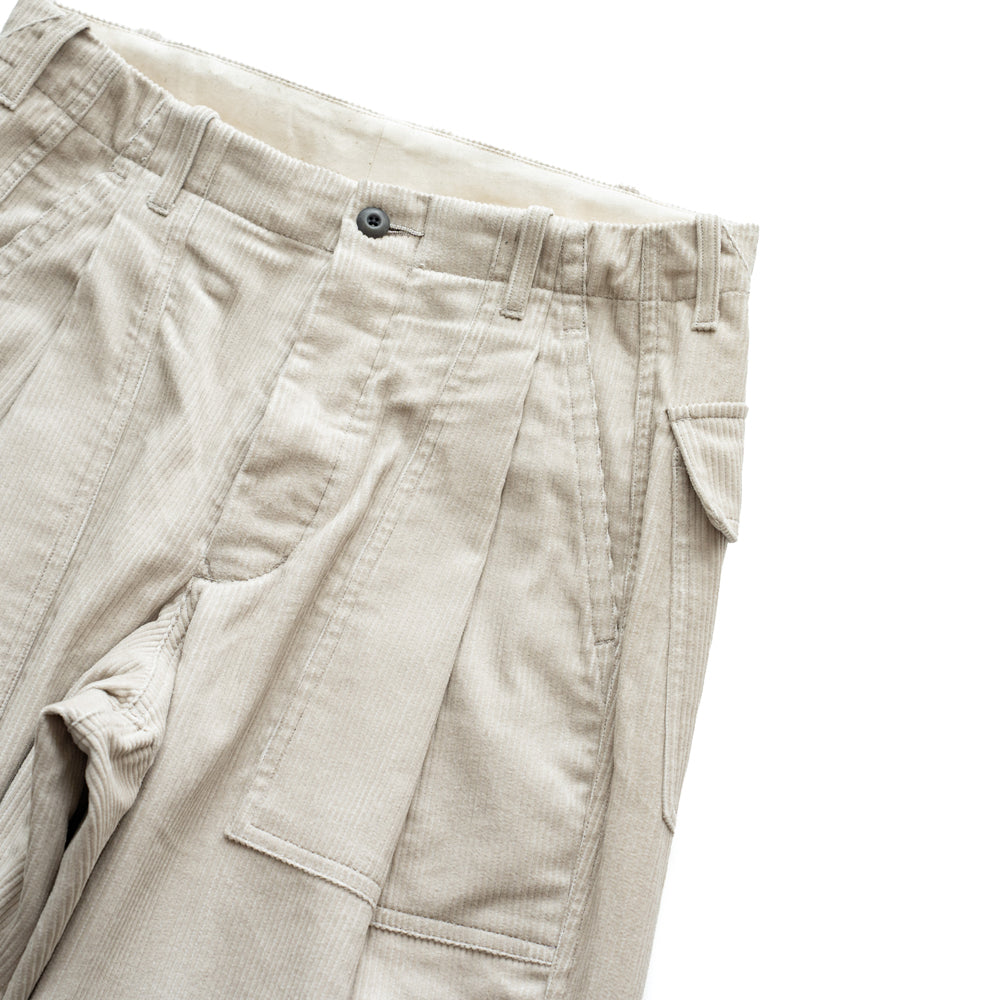 硫化染めを施したコーデュロイ生地を使用しています。中肉くらいの程よい厚みです。ミリタリーやワークウェアであるオーバーサイズのユーティリティーパンツをベースに、サイドシームを前身側に移動し、フロントには深いプリーツを施し、後身にゆとりをもたせたワイドシルエットです。