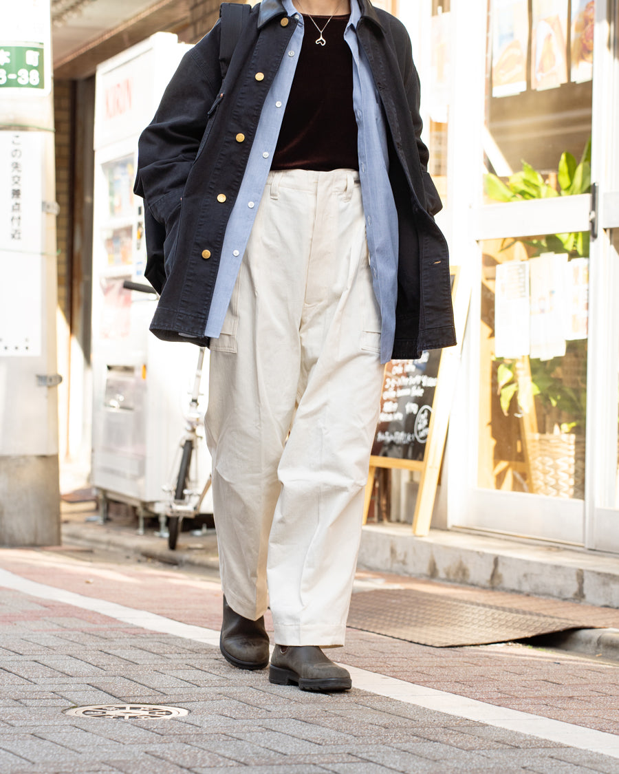 M1943後期タイプのプリーツを施した、タック仕様のパッチ&フラップポケットを配置し、腰裏はスピンドルを施し、イージーパンツとして履くことも考慮した作りになっています。