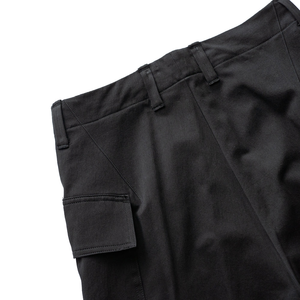 股上を深く設定したワイドシルエットに、膝のプリーツからテーパードになる様に仕上げたミリタリーパンツ。