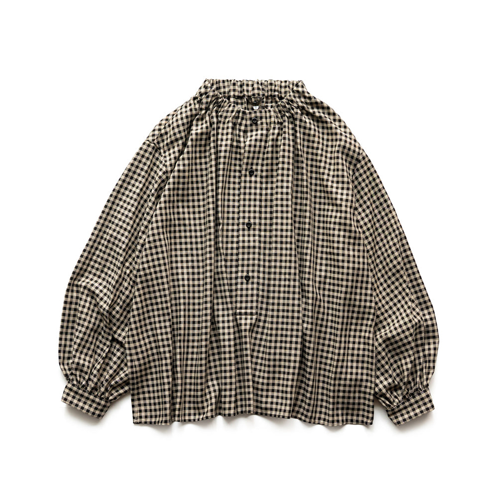 シェパードチェックの生地を使用したブラウスです。ギンガムチェックほど可愛くなりすぎない大人な雰囲気のチェック柄です。素材はレーヨン。とろみのある生地感でさらっとしています。首元は程よく詰まり、ギャザーがポイントになっています。お袖は丸みのあるシルエットで女性らしい雰囲気。落ち感のある生地なのでオーバーオールの下に重ねても嵩張らずに着用いただけます。