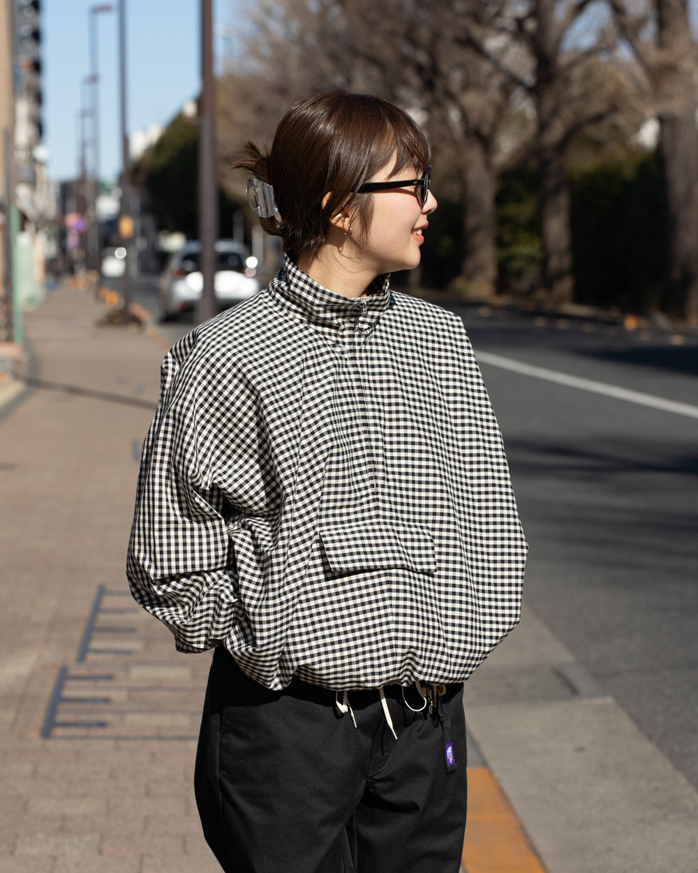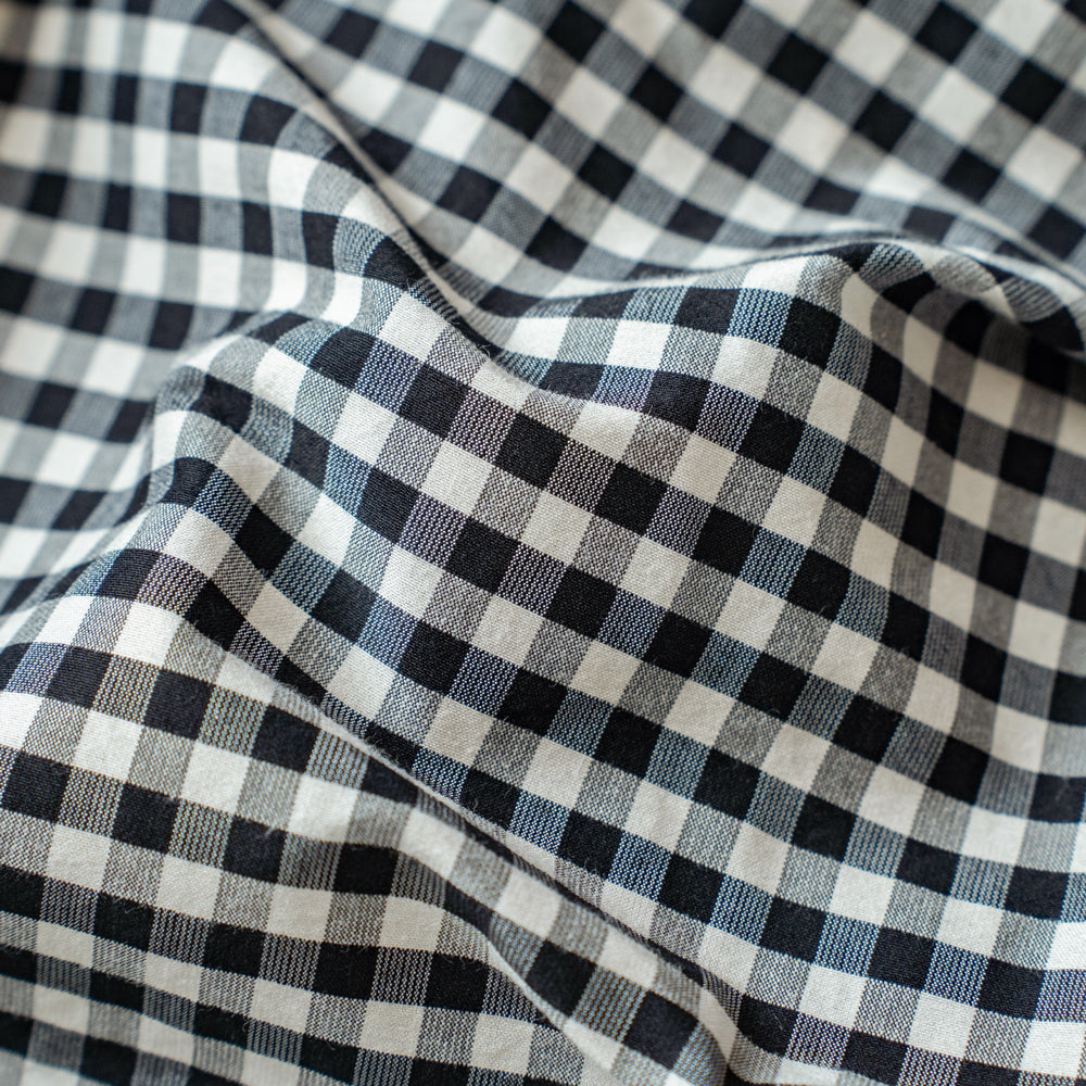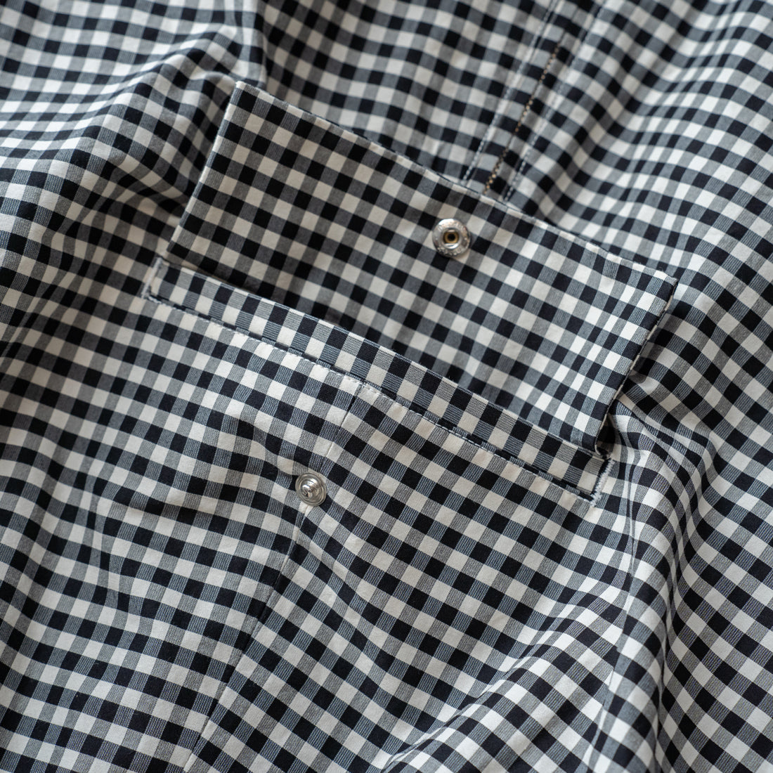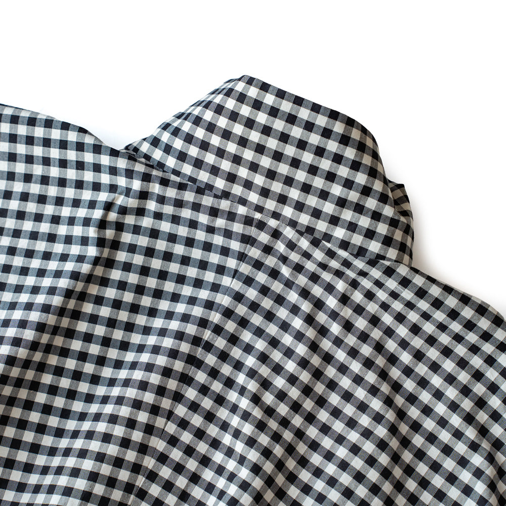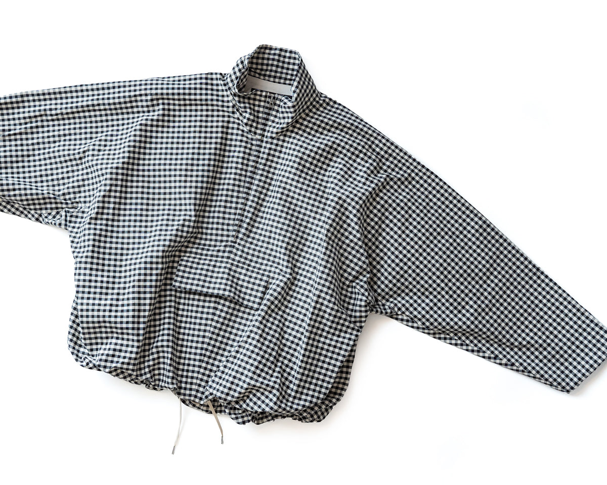 コットンシルクを高密度に織り上げたオリジナルギンガムチェック生地を使用しています。裏地にはコットン素材の生地を使用し2重仕立てになっています。袖口と裾口にたっぷりとギャザーを入れ、柔らかくエアリーなボリュームのあるシルエットに仕上げたHAVERSACKらしい1着。フロントにフラップ付きポケット、サイドにはジップ付きのポケットがついています。