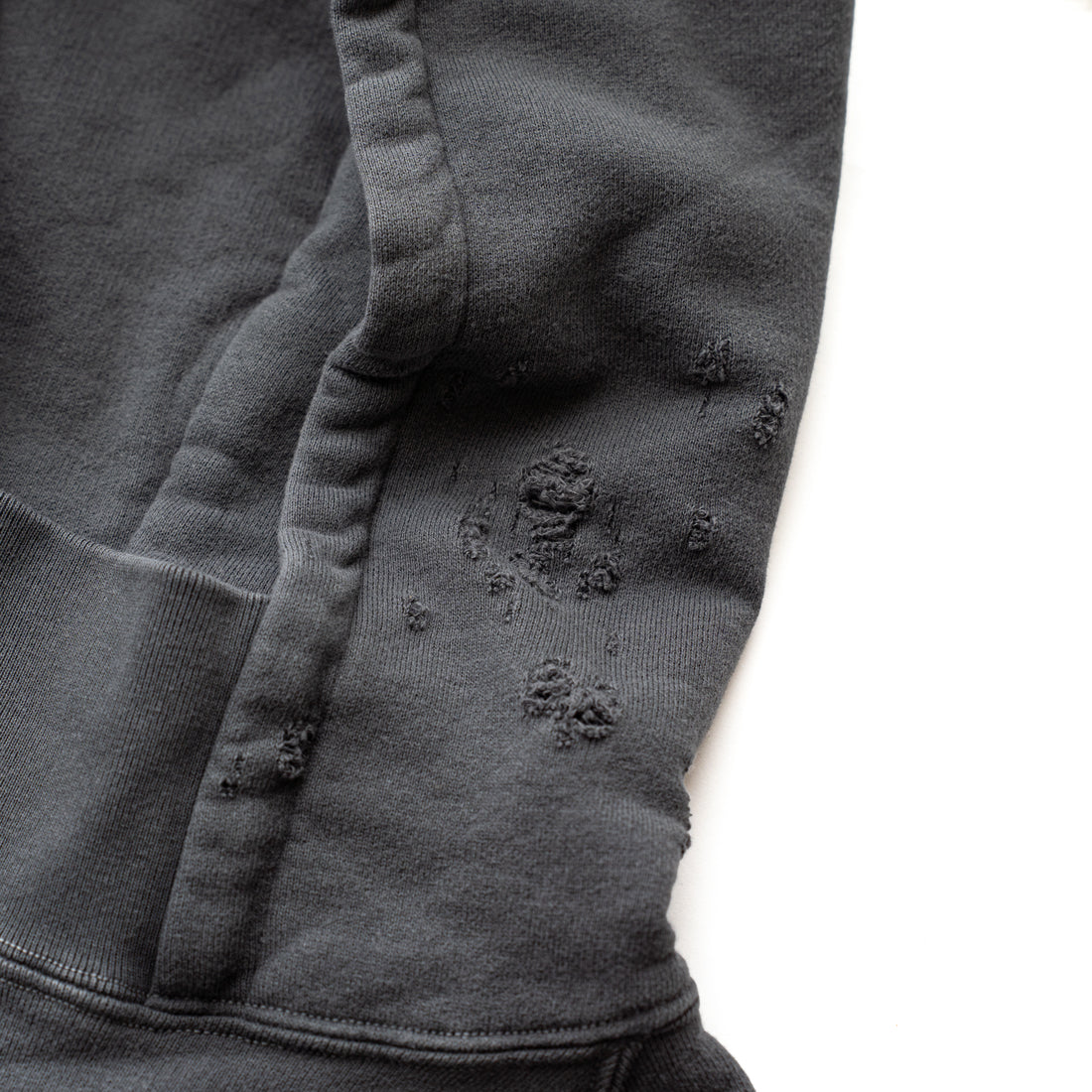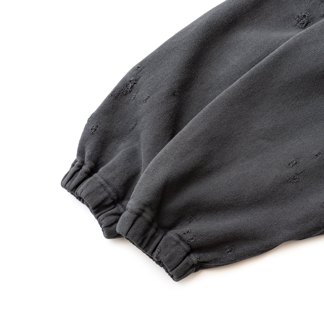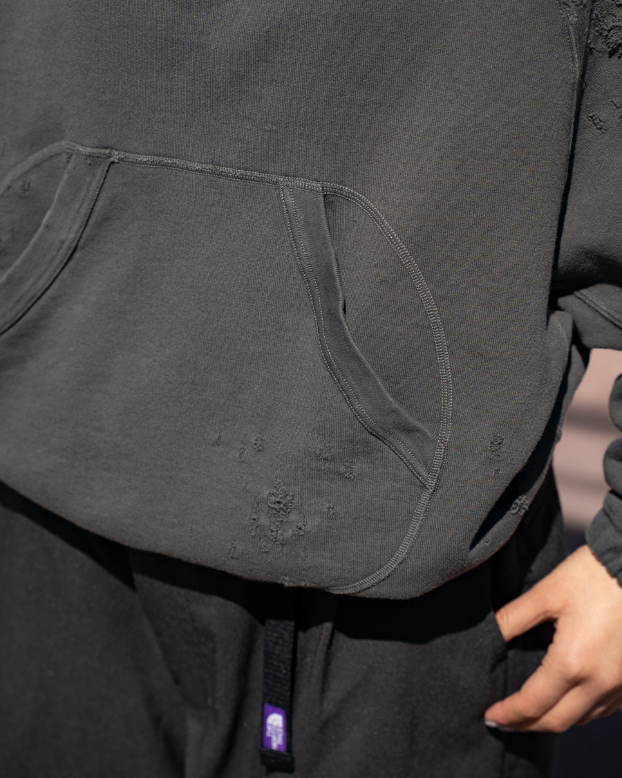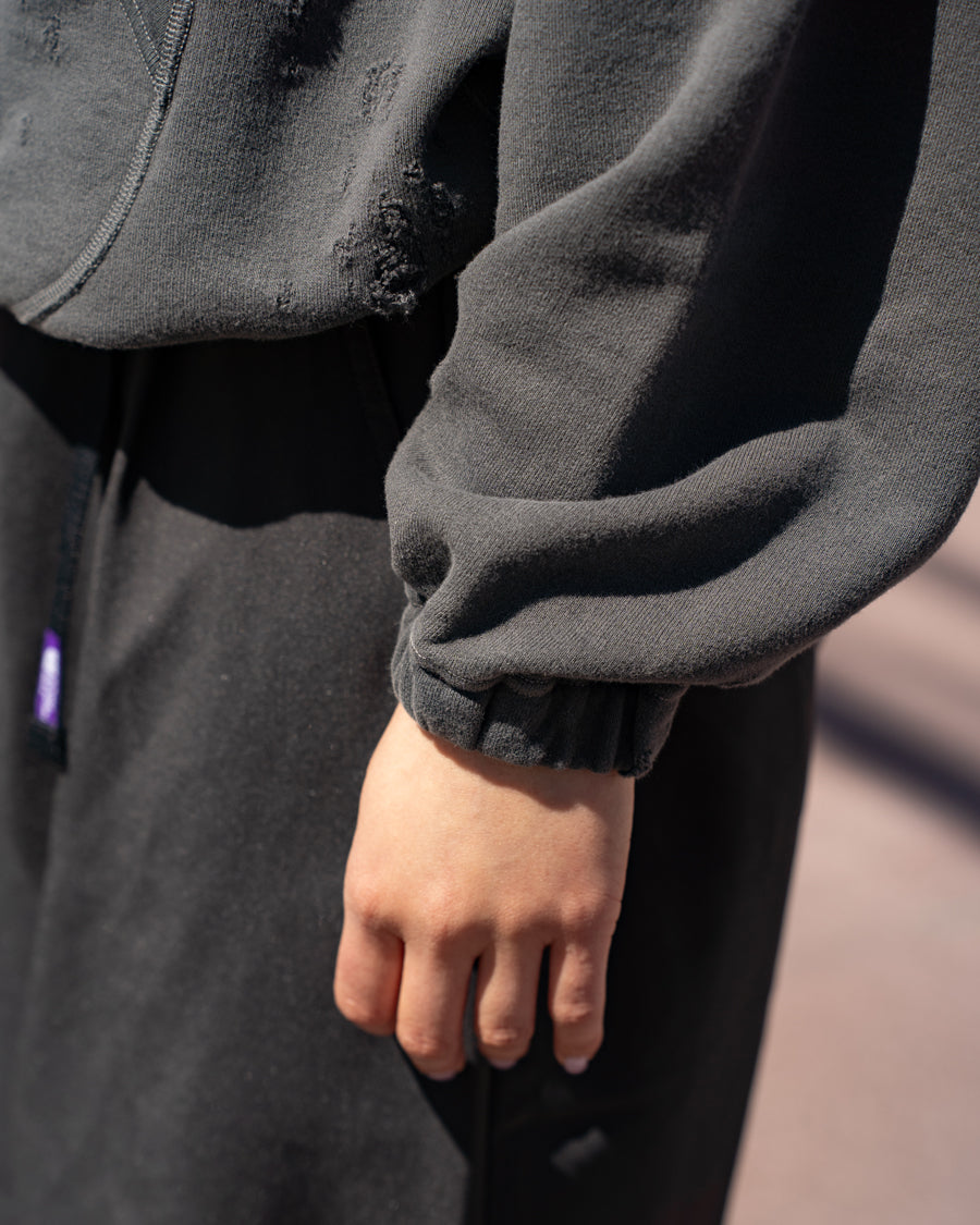 素材はオリジナルの穴の空いたダメージ裏毛を使用し、製品染のフェード加工を施し、ヴィンテージ感のある仕上がりになっています。