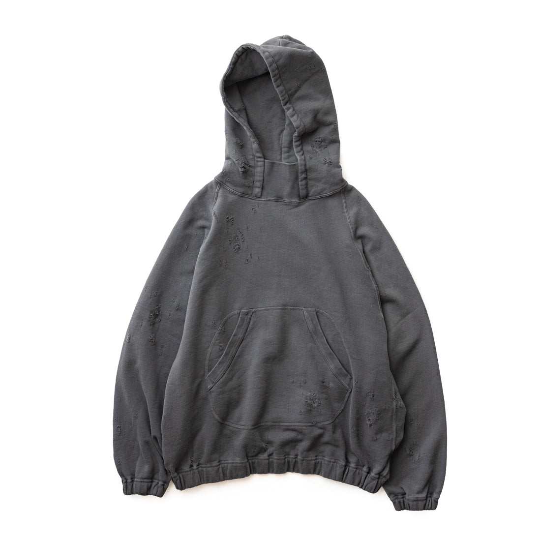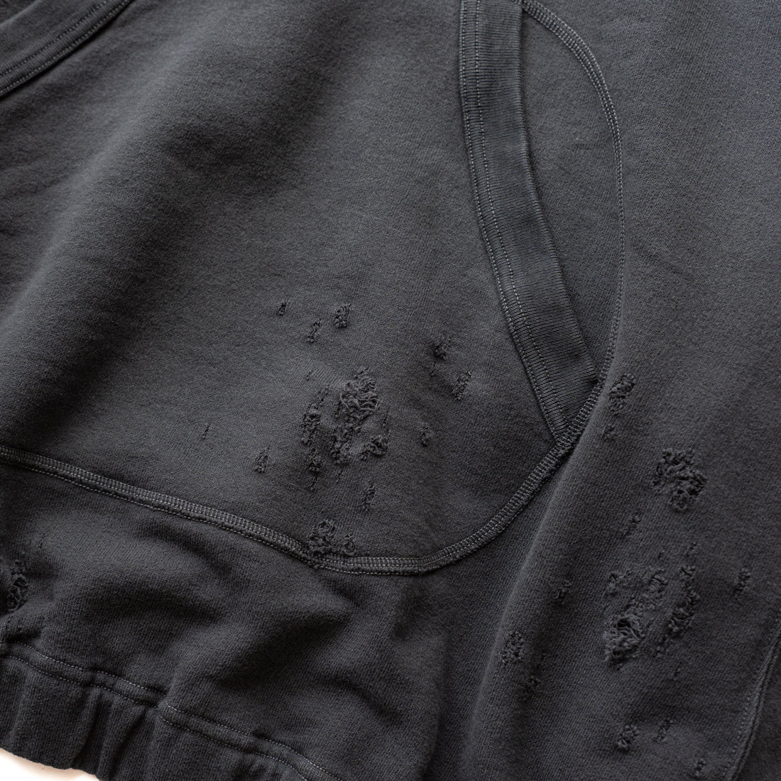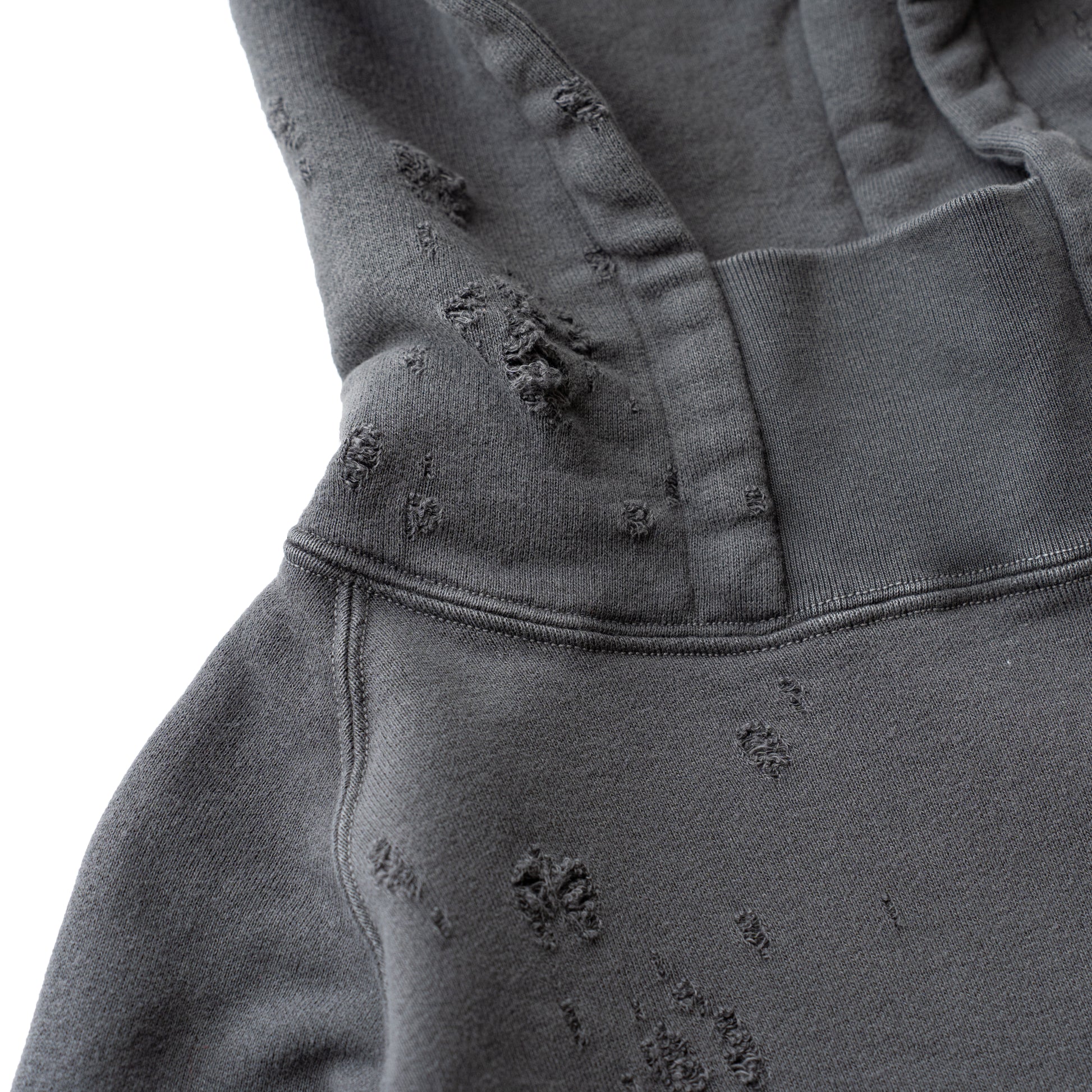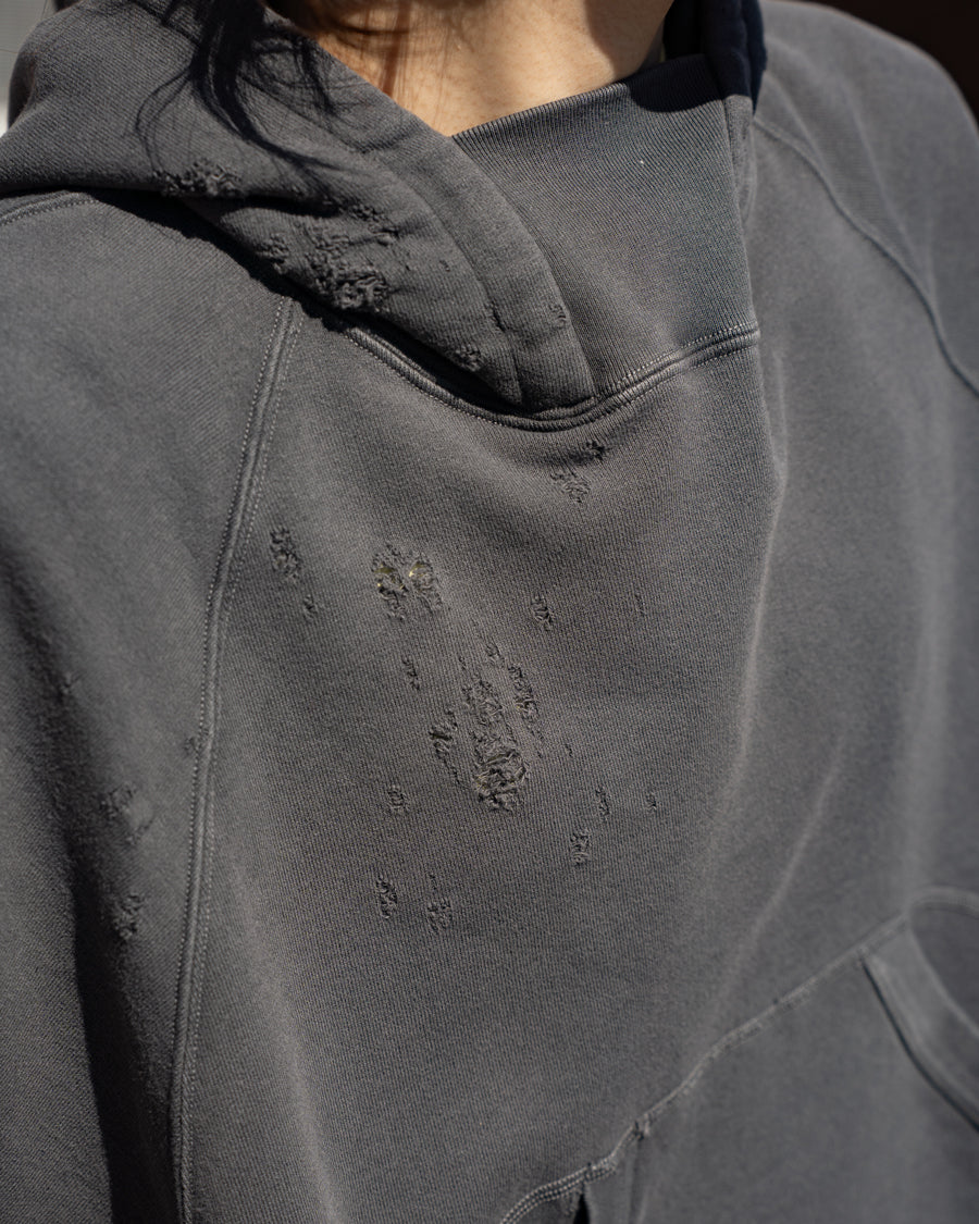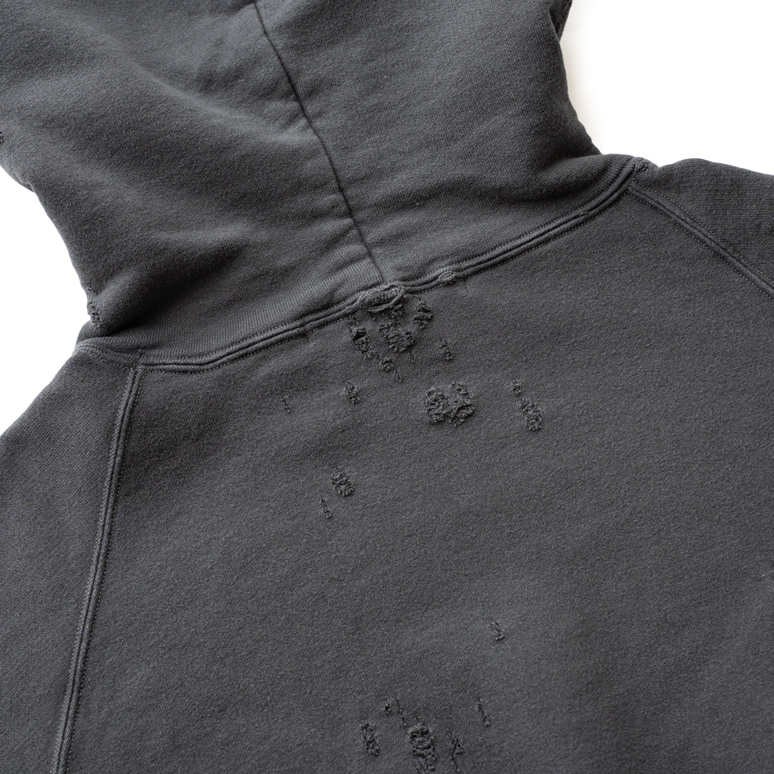 素材はオリジナルの穴の空いたダメージ裏毛を使用し、製品染のフェード加工を施し、ヴィンテージ感のある仕上がりになっています。