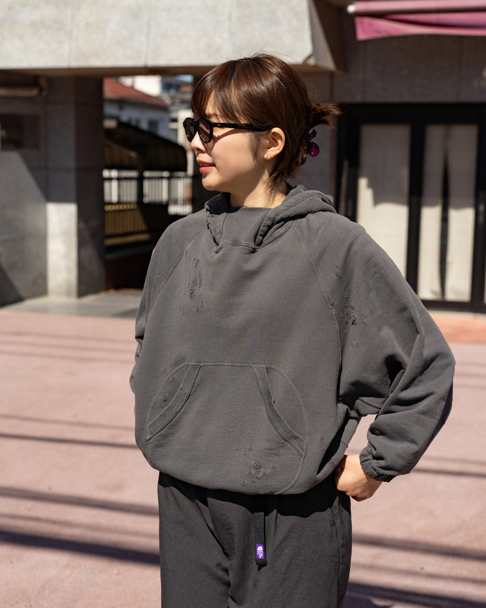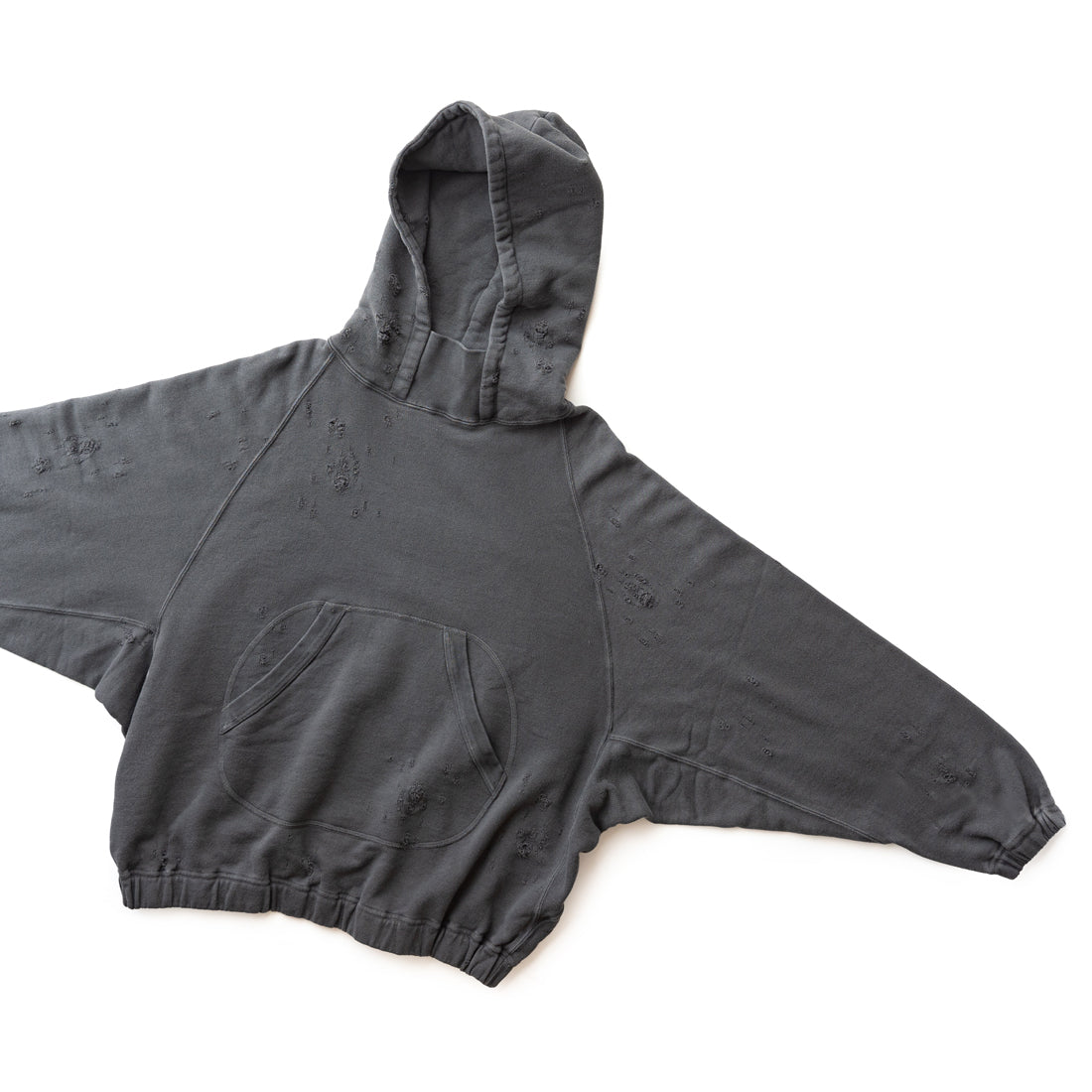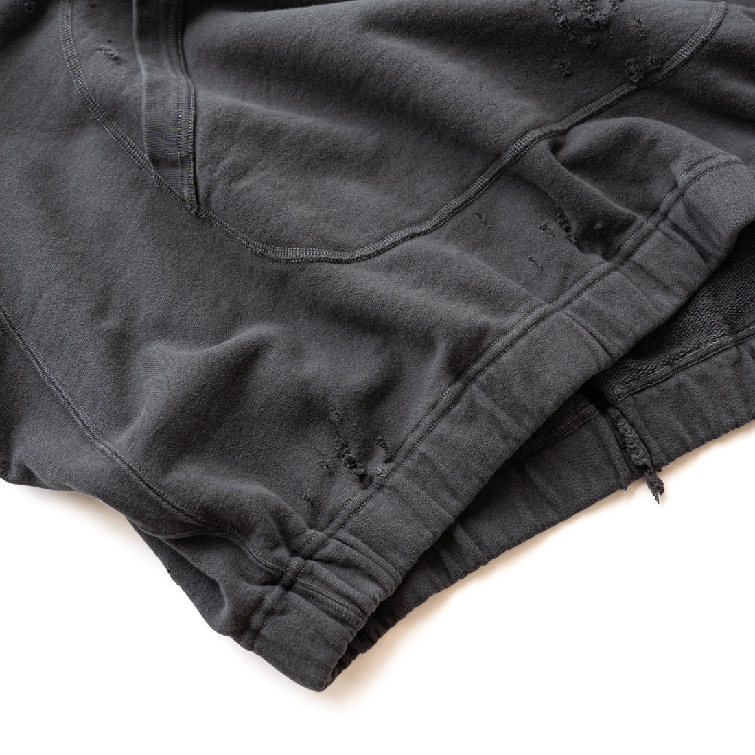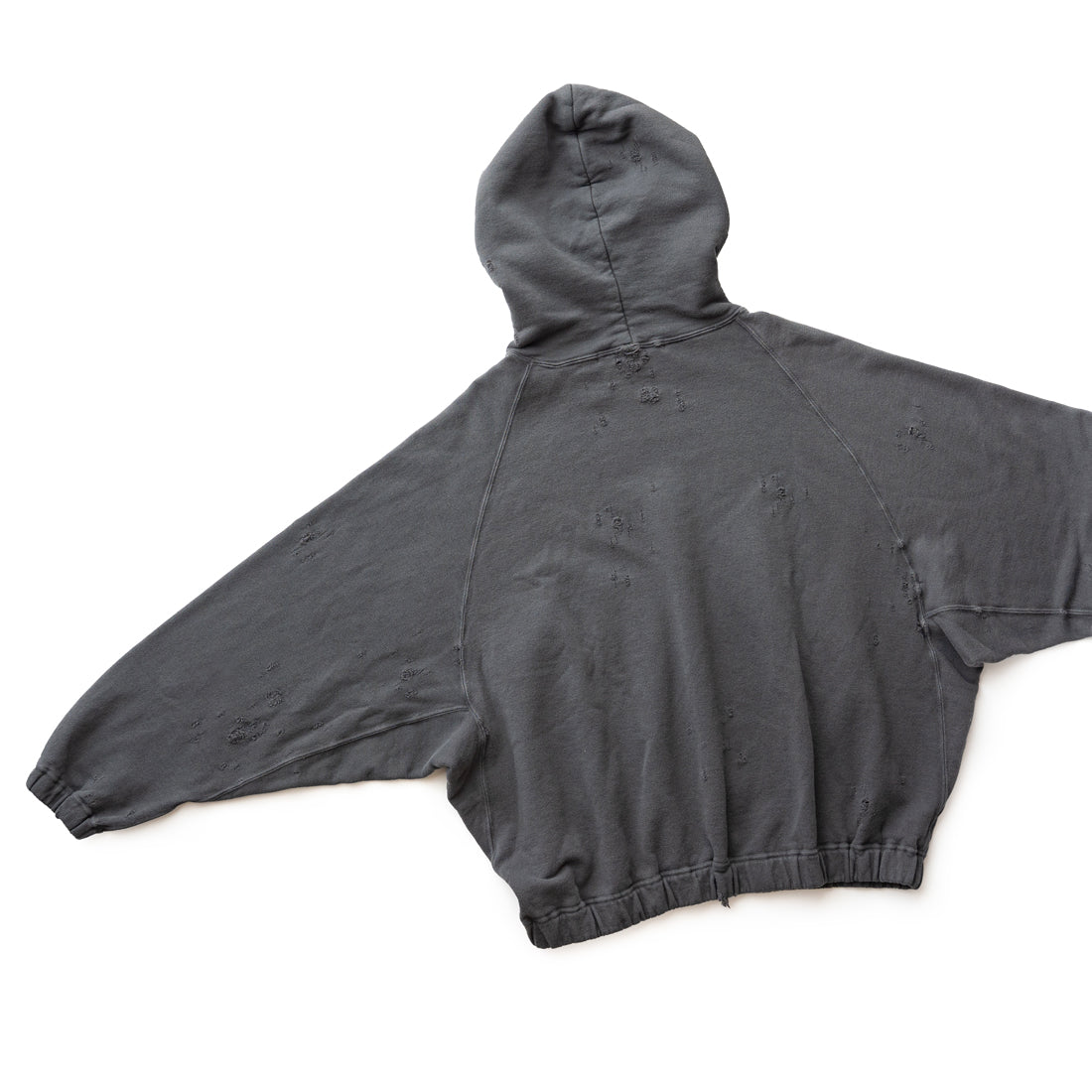 素材はオリジナルの穴の空いたダメージ裏毛を使用し、製品染のフェード加工を施し、ヴィンテージ感のある仕上がりになっています。