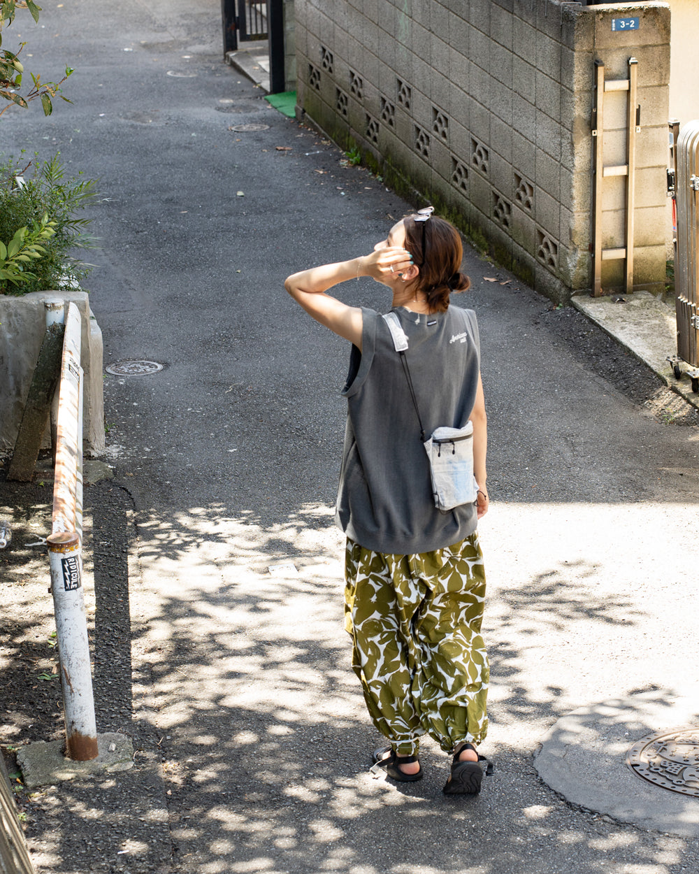 オジリナルのフラワープリントタイプライターを使用し、モード感のある印象に仕上げたワイドパラシュートパンツ。