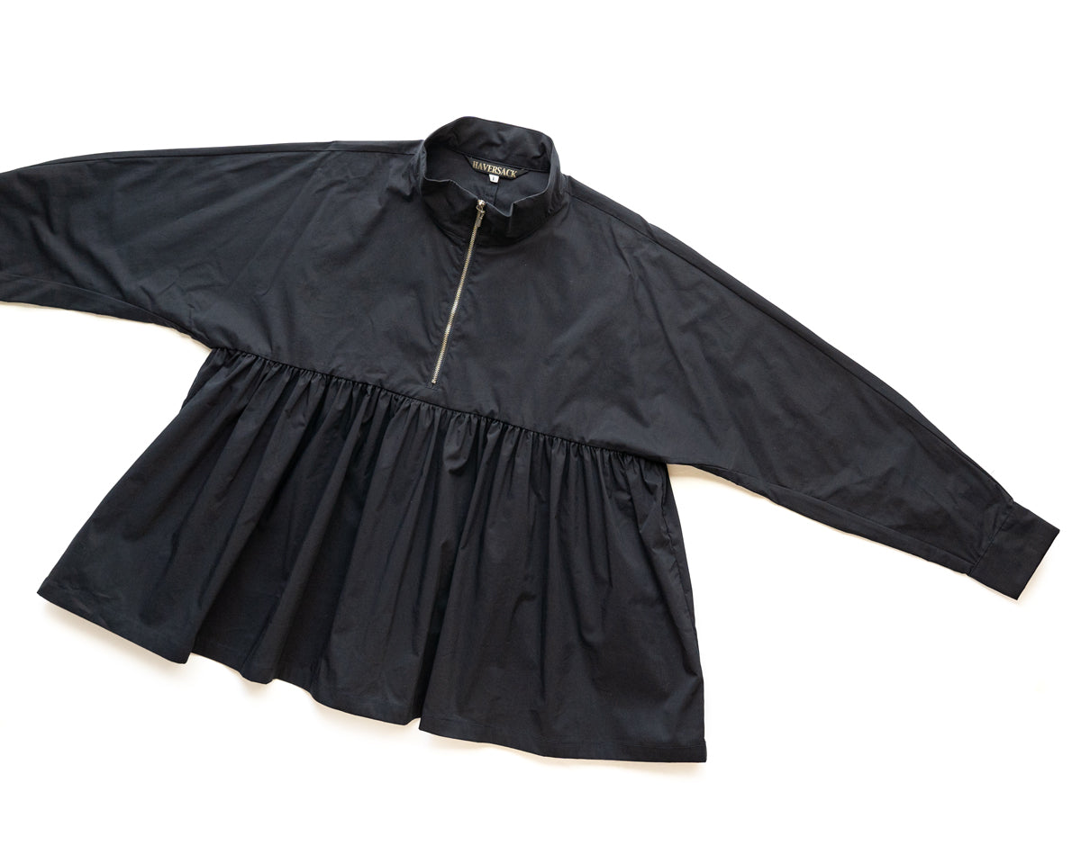 ハイネックにハーフジップ、身頃には細かいギャザーがたっぷり。袖先はカフスがつき、上品な雰囲気に仕上がっています。一見フェミニンな印象ですが、ジップやハイネックのデザインが甘さを抑えてくれて、メンズライクなボトムにも相性がいいブラウスです。