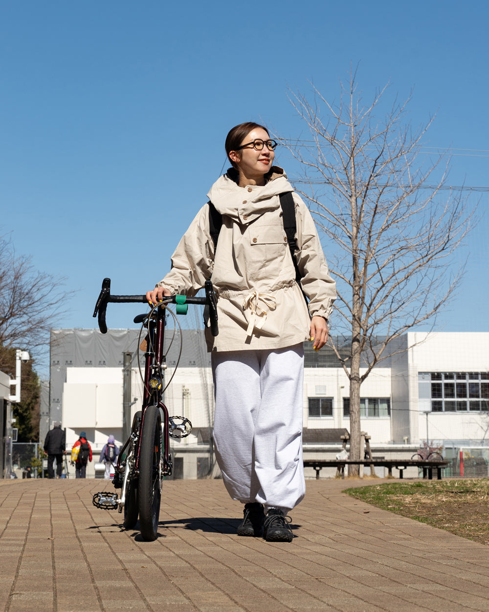 肩まで覆う大きめの後付けフードが特徴のアノラック。ゆったりとしたルーズフィットに、ウエストは杉綾テープでシャーリングできる仕様。胸の大きなパッチ、フラップポケット、腰にはシームポケットをつけ、収納性を考慮した作り。立体感のある大きなフードにはファスナーがつき、開けて首周りに変化をつけることもできます。素材には、塩縮加工を施した、高密度の生地を使用しています。生地はシャリ感があり、さらっとした肌触りです。