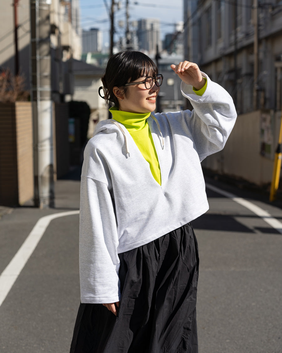 毛羽の少ないハイゲージ裏毛を使用したフーディです。3シーズン着用できる薄手のスウェットです。ミニ丈と深いVネックラインが特徴的なデザイン。袖はゆったりとしたシルエット、脇下にはマチがあるため可動域が広くストレスのない着心地です。大きめのフードは、帽子の上からでもすっぽり被れるほど。ハイウエストやワイドなボトムとバランス良く合わせて頂けます。