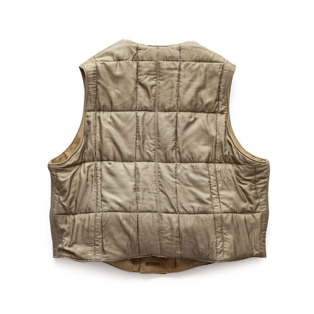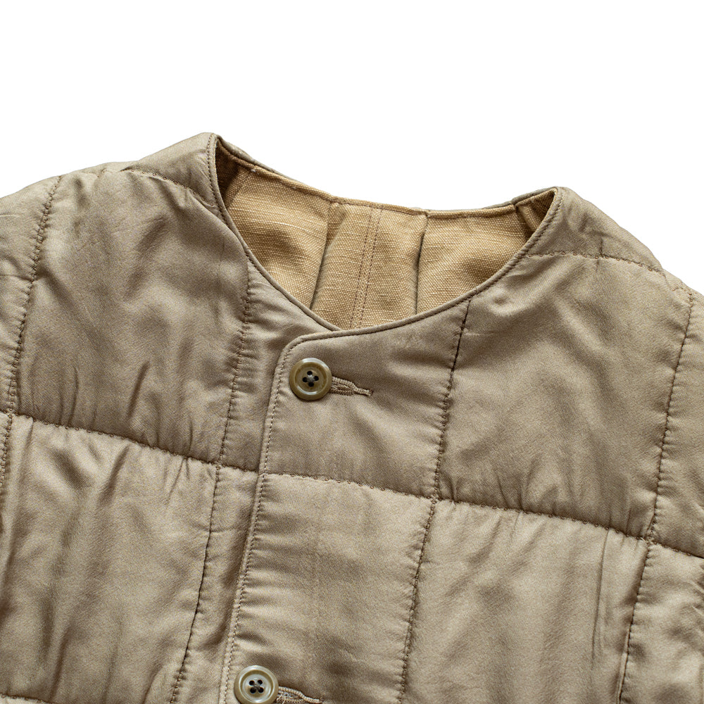 オリジナルのシルクキルティング、ヴィンテージ加工を施したコットンダックを表と裏に使用したリバーシブルベストです。