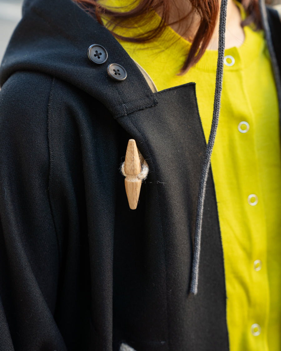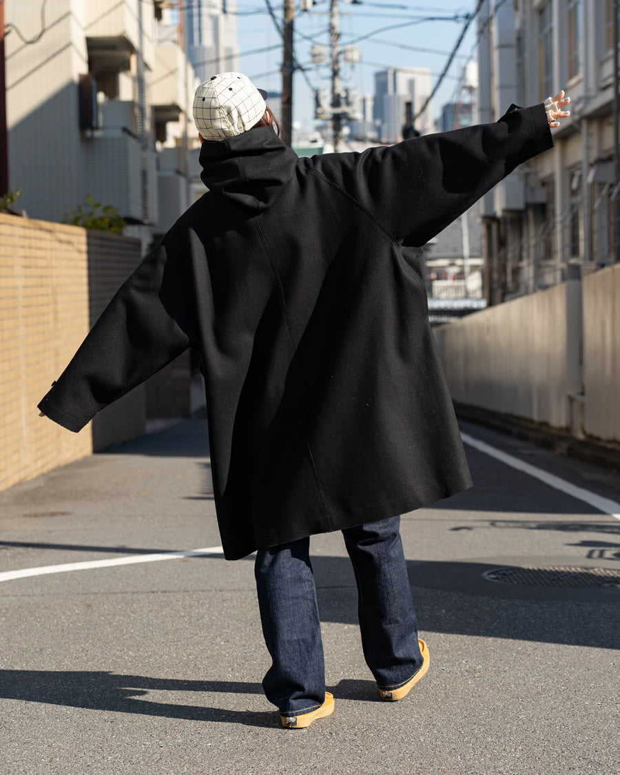 直線的なラインがイメージのダッフルコートだけど、HAVERSACKのダッフルは立体感や丸みのあるシルエットが特徴的で、ボタンを全て閉じてもサマになる。フードが大きいから帽子の上からガバッと重ねれちゃう。