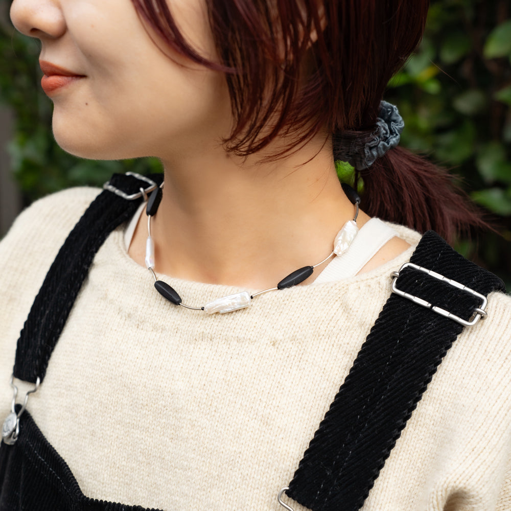 チェコのヴィンテージビーズや不揃いなパールを組み合わせたデザイン。小さなブラックのスピネルが交互に散りばめられていてさりげないポイントになっています。程よい存在感のあるネックレスでカジュアルにも綺麗めにも合わせて頂けます。