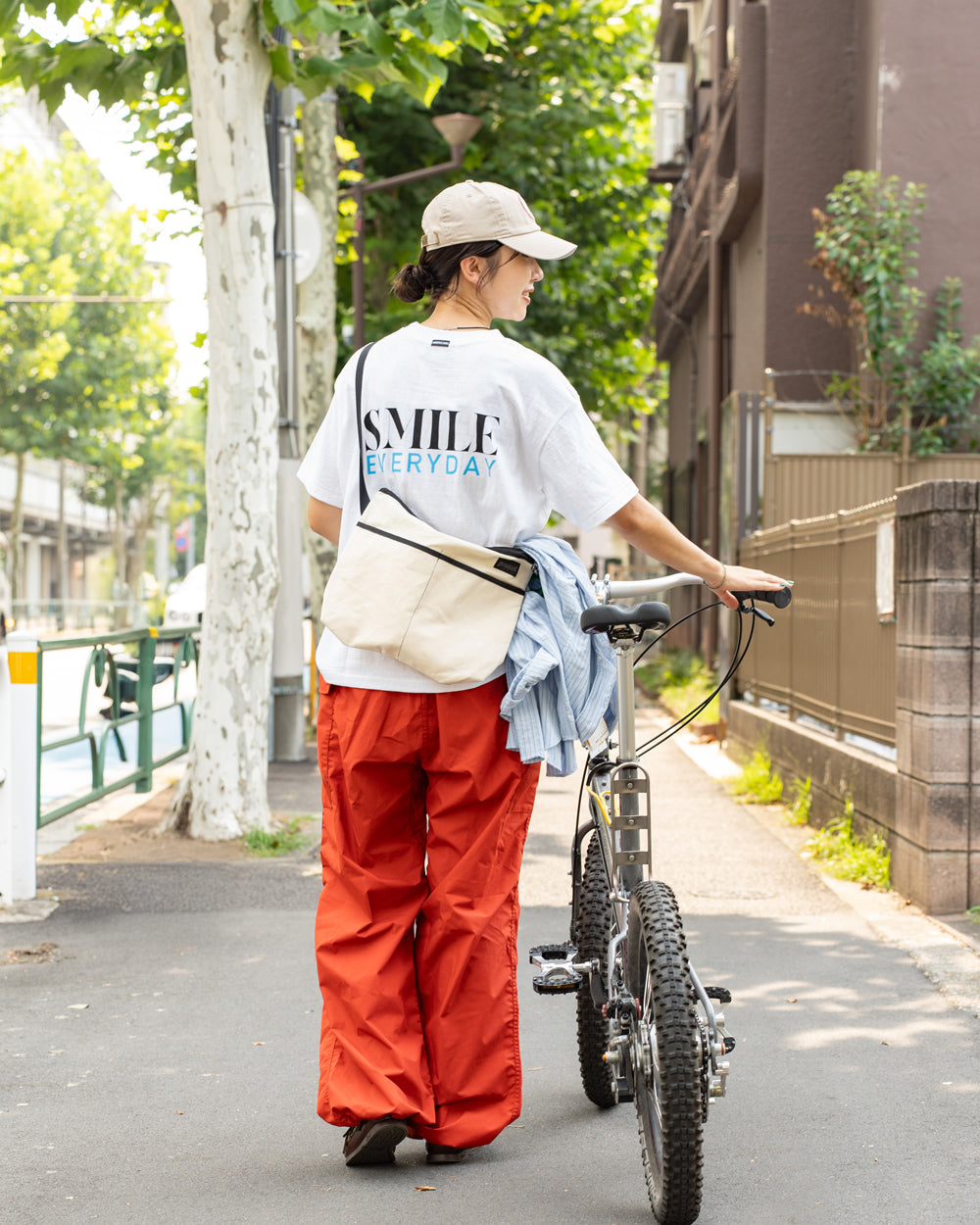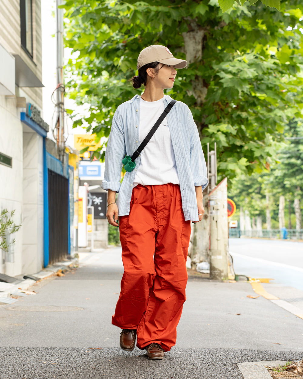 クラシックなアウトドアウェアに採用されていたポリエステル65%、コットン35%をミックスした糸で高密度に織り上げたウェザークロスを使用しています。(非フッ素系はっ水加工)とても軽やかな履き心地です。ウエストゴム仕様で紐を絞ってお好みのフィット感に調整できます。フロントはファスナー開き。裾にいれたドローコードにより風の侵入を軽減でき、シルエットの変化も調整可能です。股下には脚の可動域を広げるマチ付きで足捌きをよくしています。