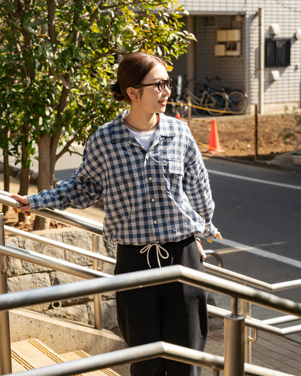 土台となる地糸)にはポリエステル芯に綿糸を巻いたカバーリングコアヤーン、ライン部分にはムラ糸を使用することで、収縮差によって生まれる自然なシワ感を表現しています。タテ糸とヨコ糸の色を微かに変えることで生まれる色の立体感も魅力です。裾周りは調整が可能なドローストリングコード仕様。リラックス感のあるシルエットです。とても軽量でさらっとした着心地なので、暑い時期は羽織としても活躍すると思います。