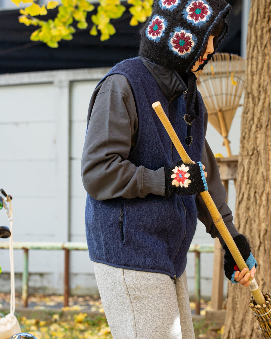 モヘアを使用したジップアップベストです。起毛加工を施していて、アウトドアウエアのフリースのような膨らみ感を再現しています。厚すぎず薄すぎずちょうどいい生地厚です。ダブルジップ仕様。ゆとりのあるオーバーサイズフィットなのでスウェットなどの上からも着用可能です。秋はアウターとして冬場はミドルレイヤーとして使えば防寒性も高まります。