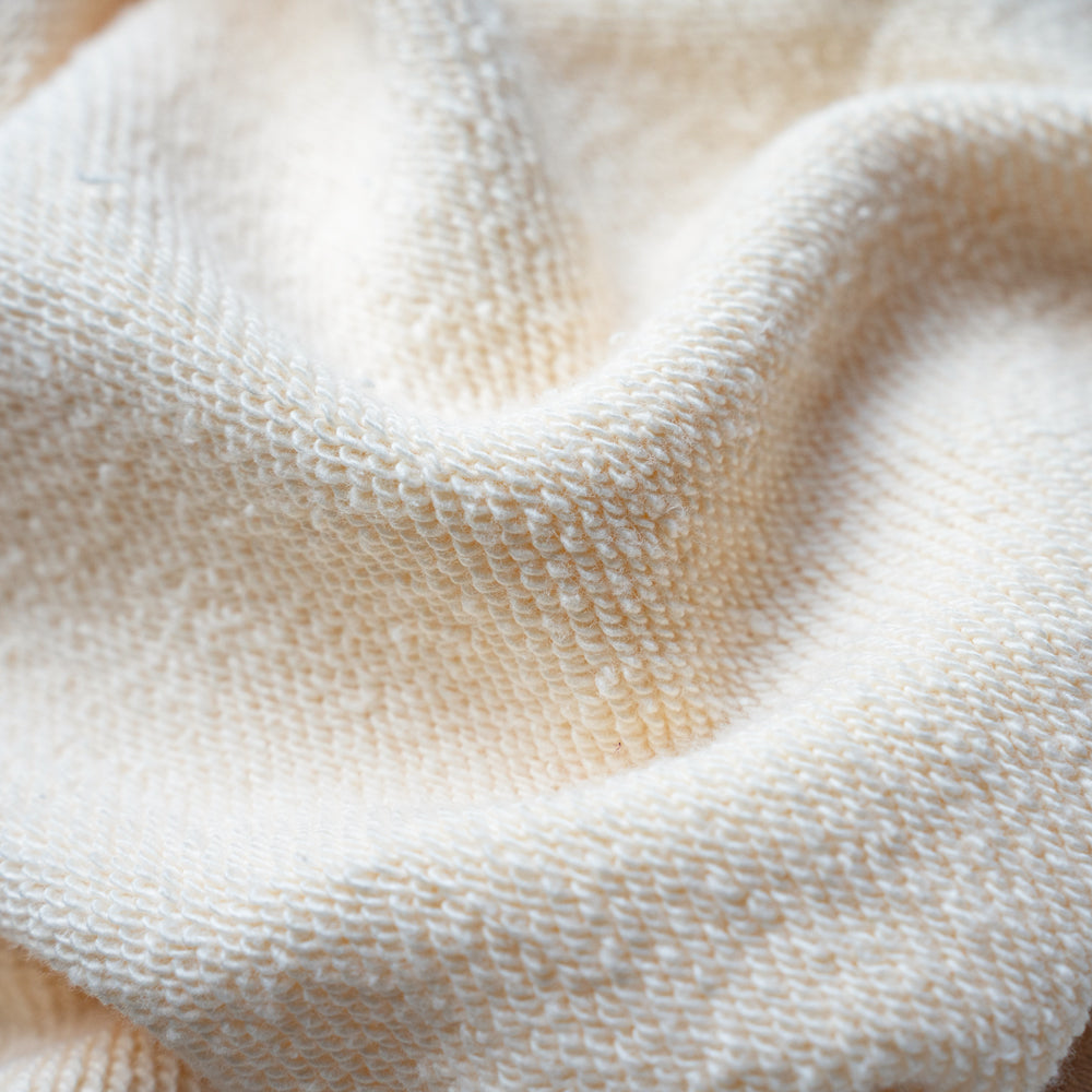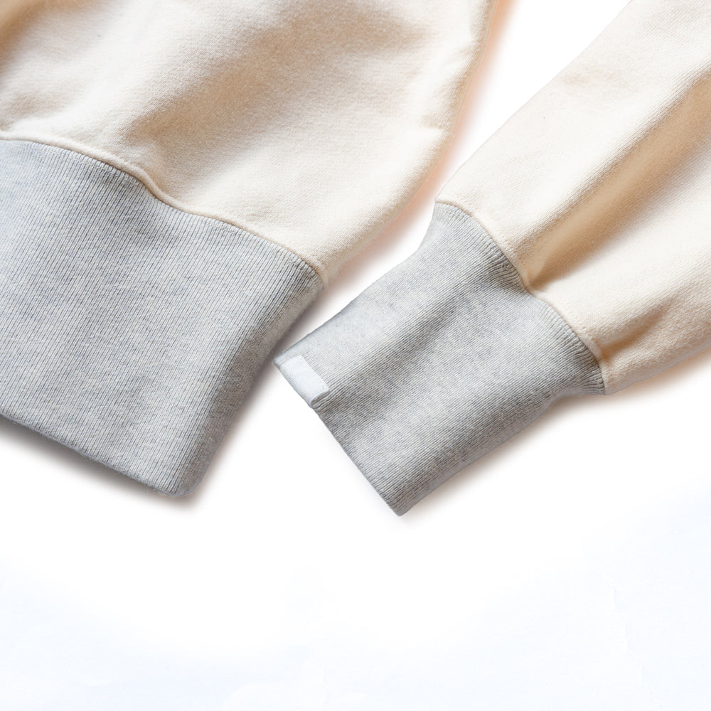 ヴィンテージスウェットに見られるダブルガゼットのデザインを落とし込んだ1着。ガゼットは首元の生地の伸びを防ぎ、補強するためのV字型の三角リブのこと。袖口や裾のリブの切り替えもさりげなくポイントになっています。厚すぎず薄すぎない生地厚で柔らかな裏毛です。ややコンパクトな着丈でバランスのいいシルエットなのであらゆるボトムと合わせやすいと思います。