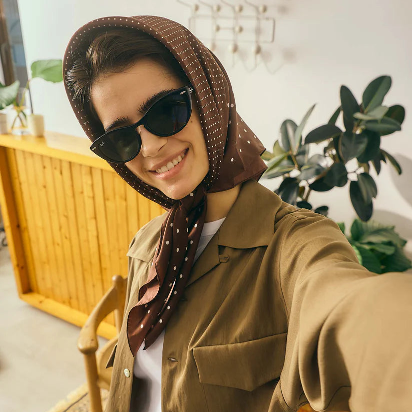 シルク100%のスカーフ。2種類のドットがプリントされています。頭に巻いたり肩や首に巻いたり。スタイリングのアクセントになるので