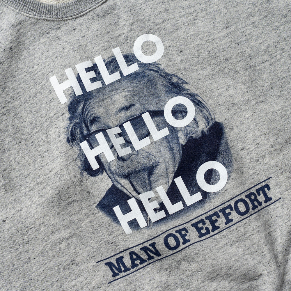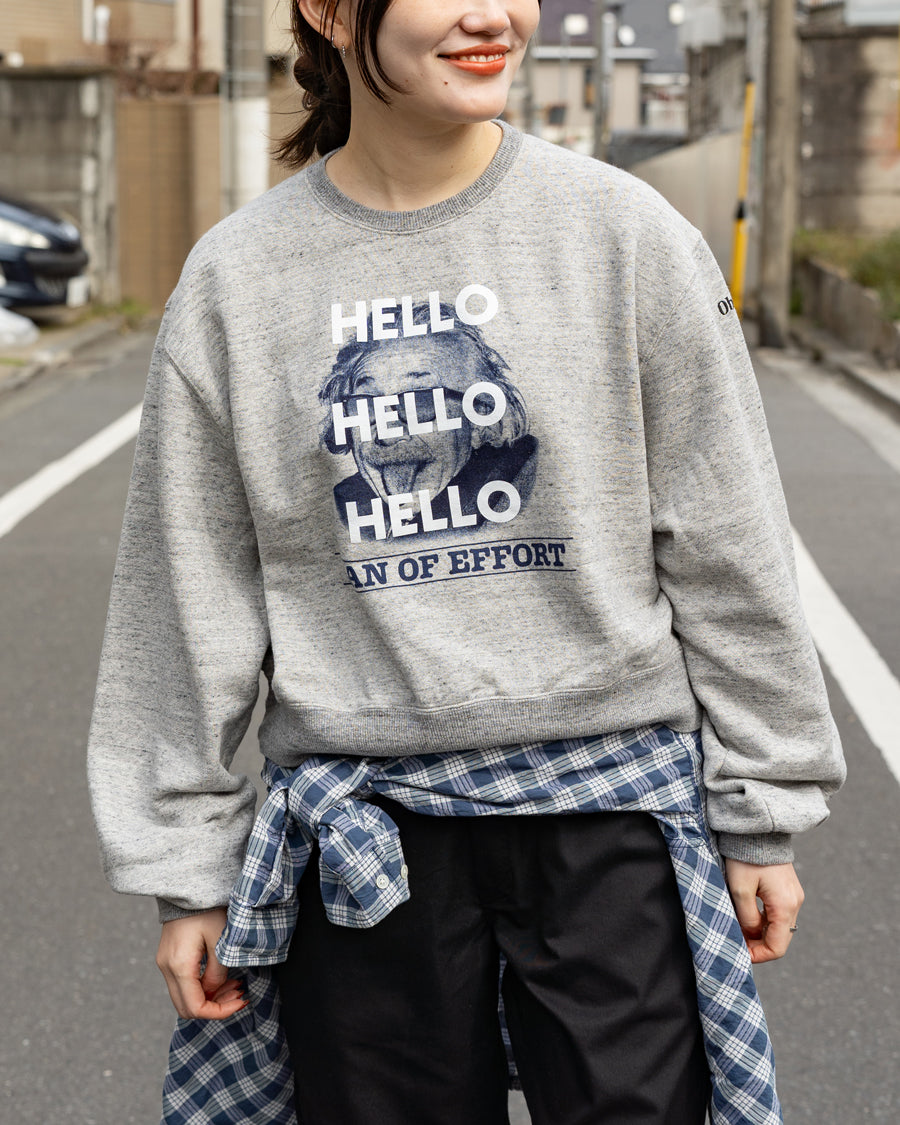 アインシュタインのフェイスプリントに"HELLO"をオーバープリントした人気のシリーズ。ボディは程よい肉感の柔らかな裏毛です。ゆったりとした身幅に着丈はややコンパクト。お袖は少し長めで袖口に生地がたまった感じもかわいいです。