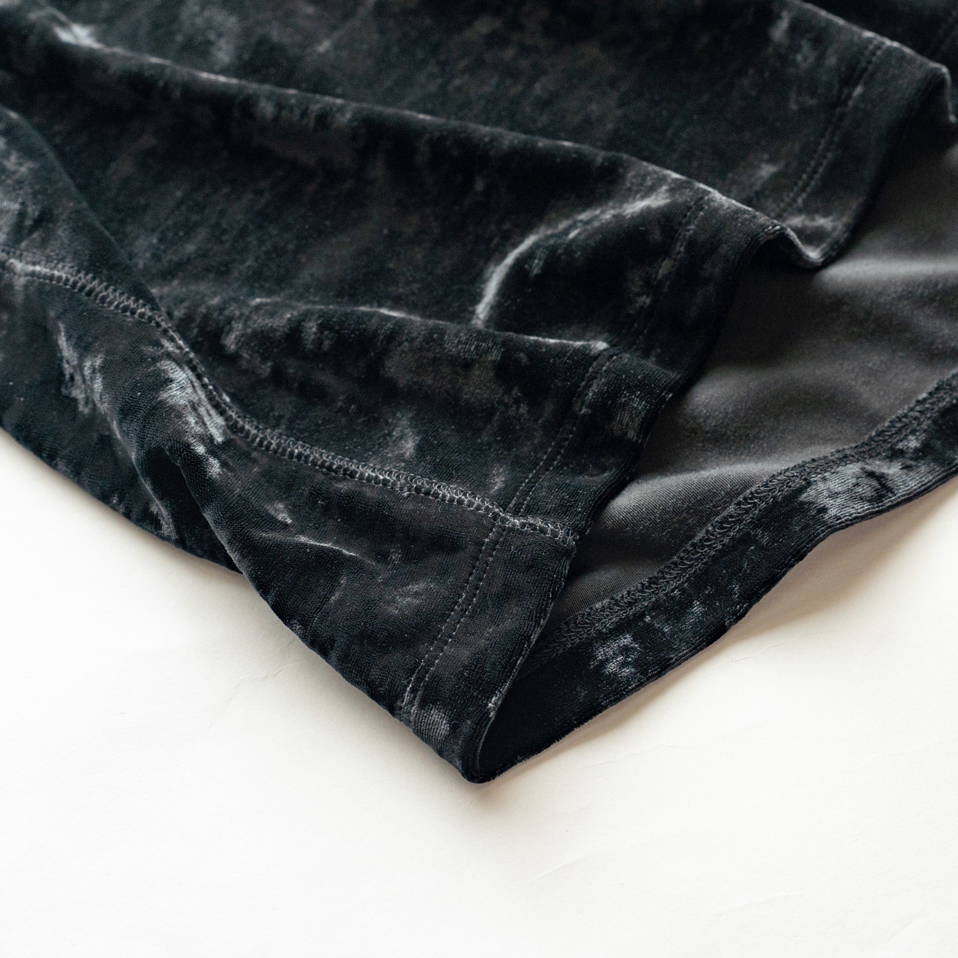 クラッシュベロアを使用したTシャツ。程よい肉感があり、ベロアのムラ感がいい雰囲気です。ややコンパクトで女性らしいシルエット。年々長くなる夏から秋への移行期に取り入れやすい秋冬アイテムです。同素材のカーディガンとのアンサブルもおすすめです。