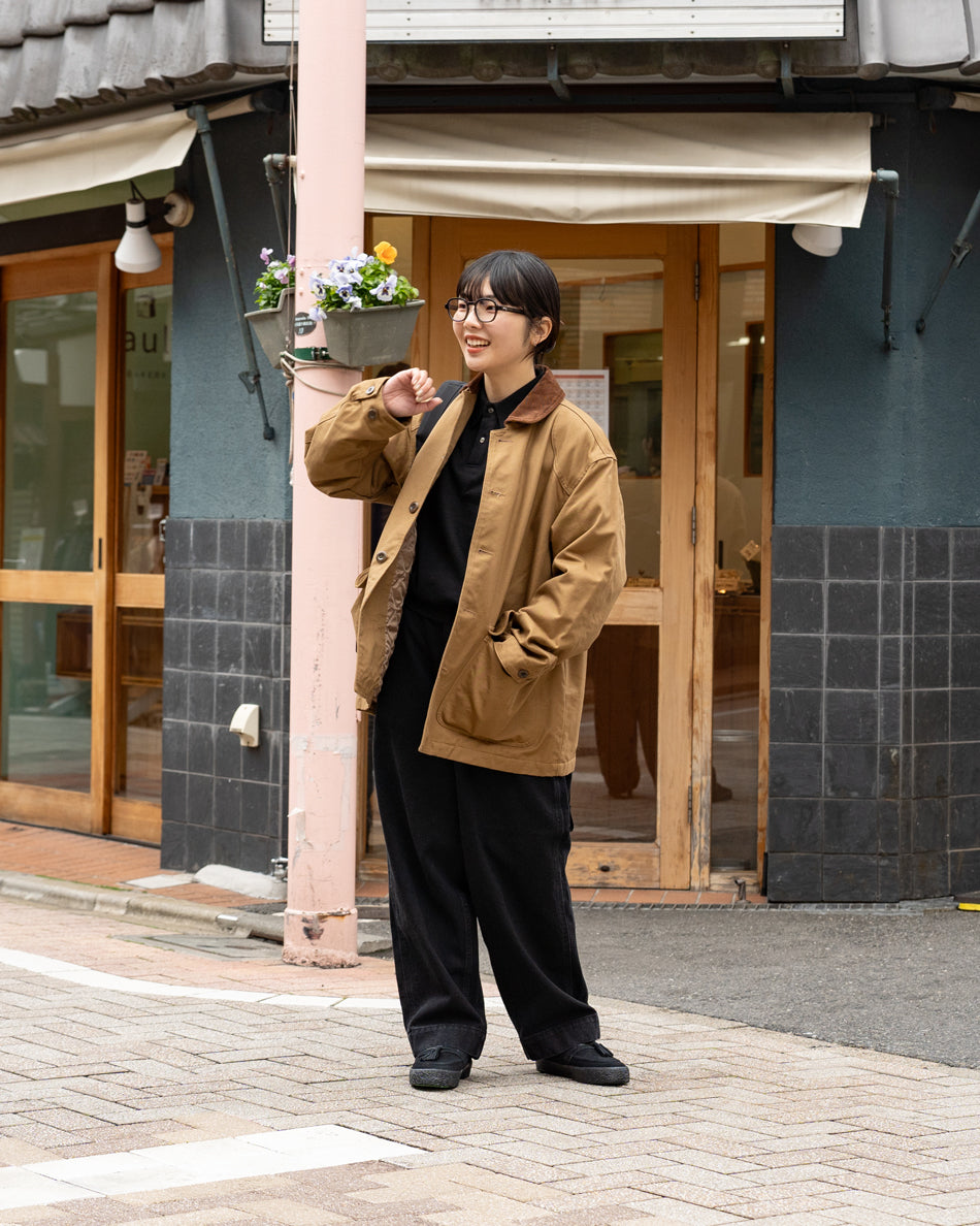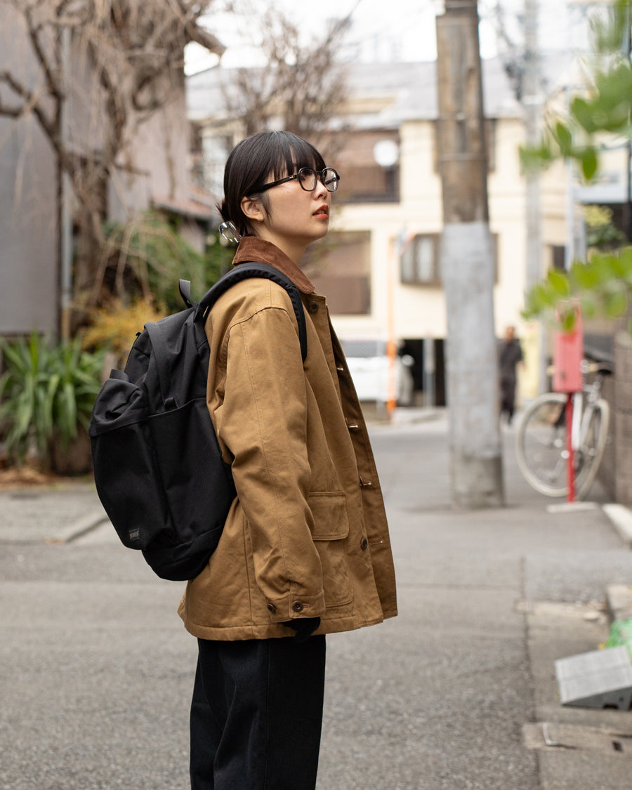 フロントポケットやフラップはやや大きめでスマホやお財布がすっぽり収まる深さに。表地はコットン。ワークウェアらしいハリ・コシのある生地感です。裏地はキルティング仕様なので防寒性があり、春先など広いシーズンで活躍してくれます。