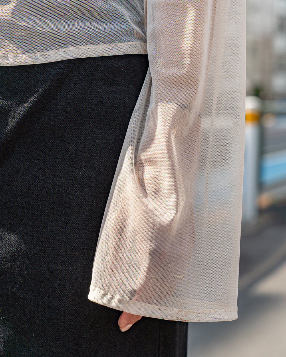 メッシュ素材のロンTeeです。ストレッチ性があってストレスのない着心地。細身すぎない絶妙なシルエットで袖はややフレアになっています。キャミソールやタンクトップだけだと心もとないときや露出を抑えたいシチュエーションにもおすすめです◎