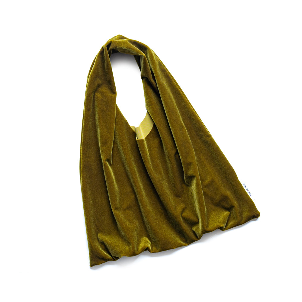 ベロア素材を使用したバッグ。マチのないシンプルなデザインです。スマホやお財布など身の回りのものを持ち運ぶのにちょうどいいサイズ感。スタイリングのポイントにもなりますね。