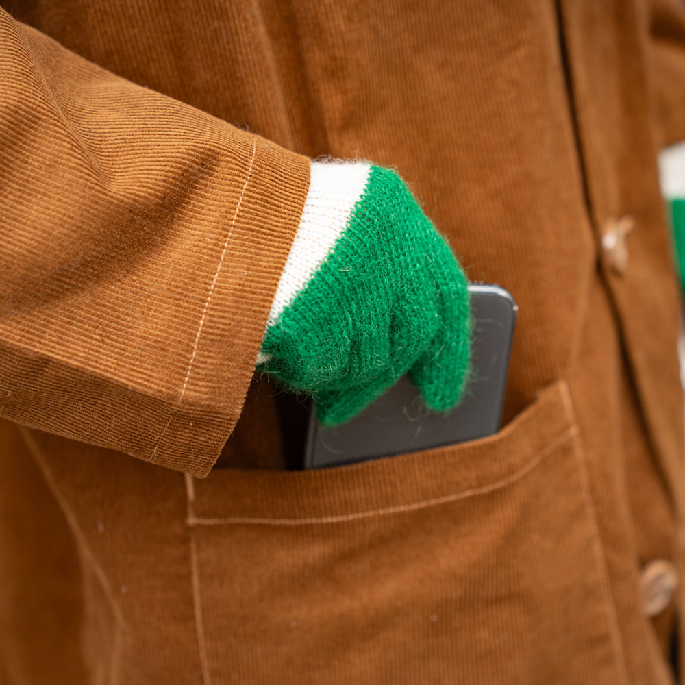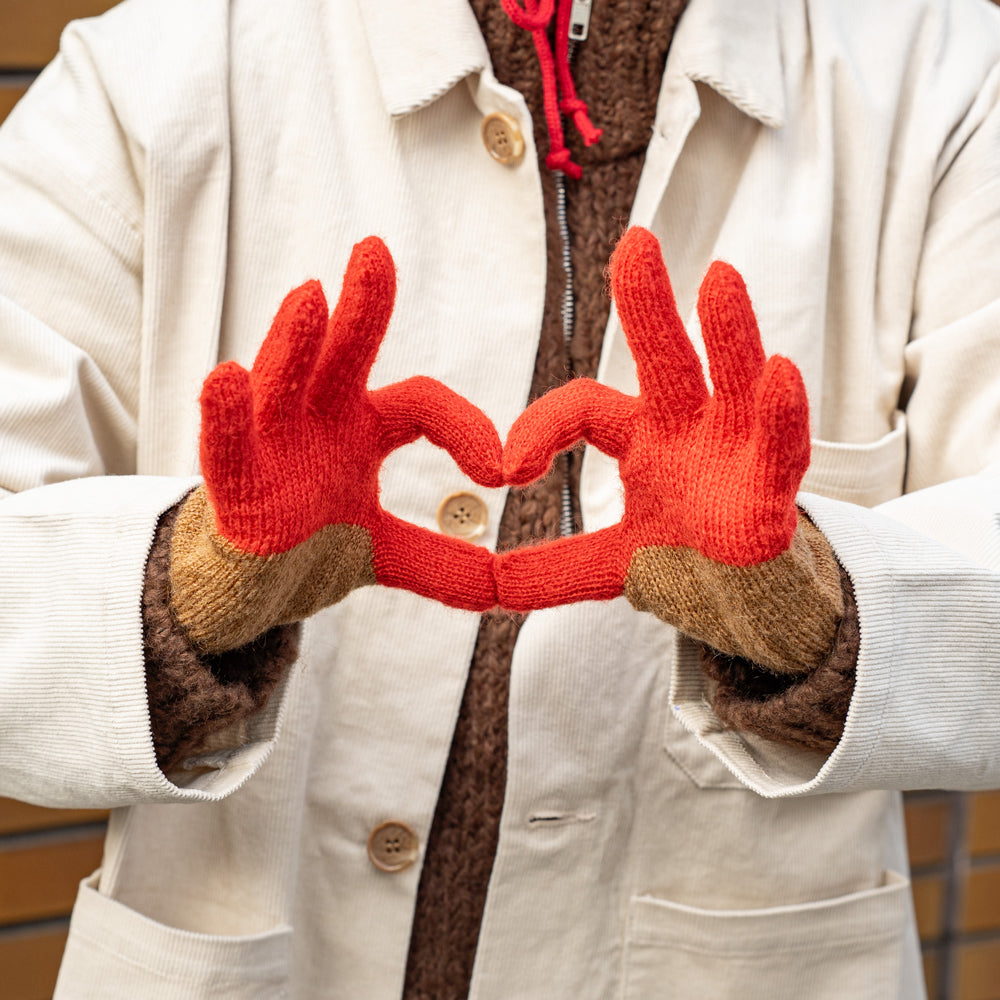 モヘア素材と色使いにこだわったGUNTE。 実際に軍手を編む機械を使い、軍手と同じ工程で作られています。 毛足が長く起毛したモヘア素材は、吸湿性が高いことから蒸れにくく、サラリとした肌触りが特徴。 繊維の表面が滑らかなので、上品な光沢感があります。
