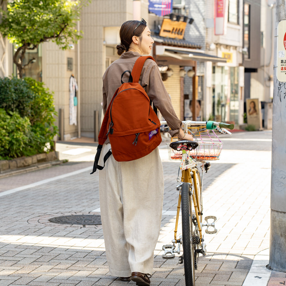 70年代にTHE NORTH FACEで作られたデイパックのデザインをベースに素材やディテールをアップデート。ショルダーの付け根の補強はレザーパーツを使用し忠実に再現しています。素材にはリサイクルポリエステルで織ったオリジナルのライトオンスキャンバスを使用。環境に配慮したフッ素化合物を使用しないPFCフリーのはっ水加工で機能性をプラスしています。裏地にはリサイクルナイロンオックス。 ショルダー部分には肩への負担を軽減できるよう2種類のクッション材を使用するという拘り。