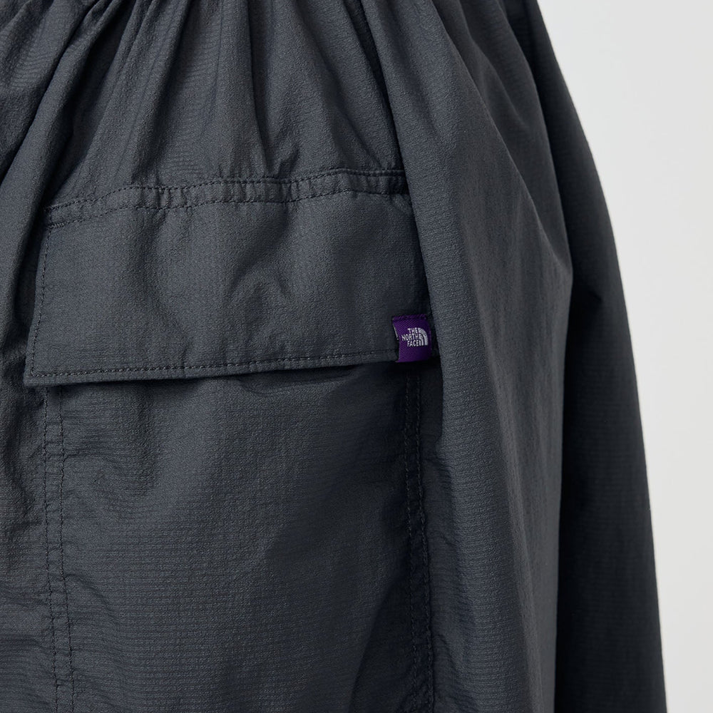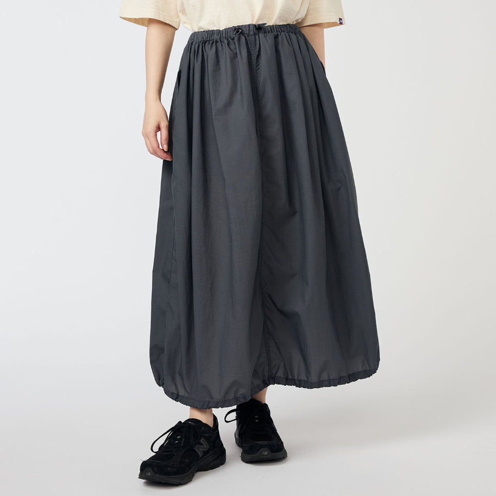 2.5レイヤー12デニールナイロンリップストップ生地使用した軽量のオーバースカート。非常に軽い仕上がりで着肌離れが良い素材です。製品染めによって自然なムラ感と深みのある色合いに仕上がっています。ウエストはゴムシャーリング仕様とサイズの微調整が可能なゴムコードとストッパーがついています。裾のコードストッパーを絞ることでふんわりと広がるバルーンシルエットに変化します。雨の日のボトムスの上から穿いたり、コーディネートのアクセントとなるアイテムです。