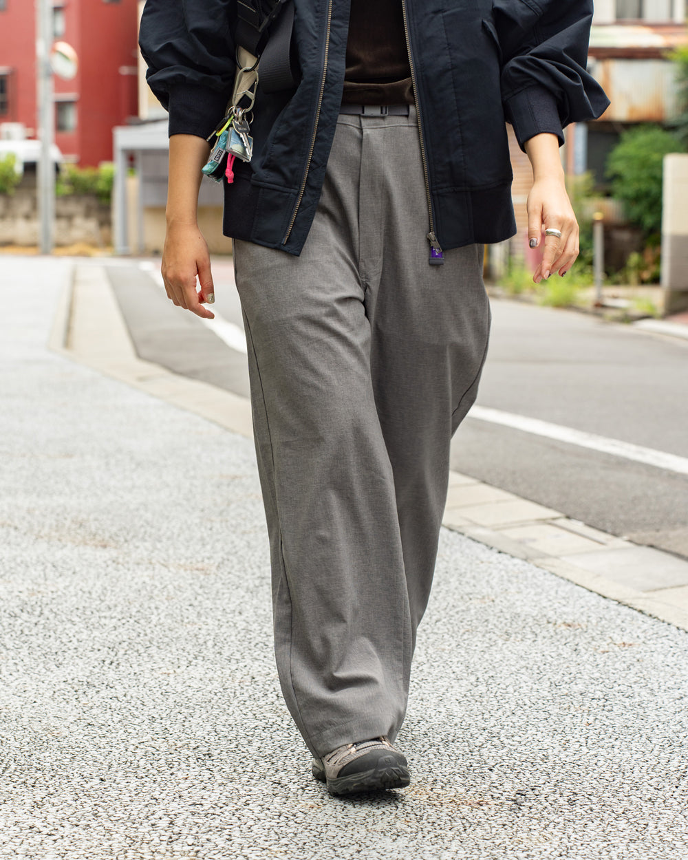 ポリエステルトロピカルを使用したフィールドワークパンツです。強い撚りを加えたリサイクルポリエステル糸を使用した生地に自然なシワ感、リネンライクな風合いを表現しています。ドライなタッチで肌離れがよく湿度の高い時期も快適に過ごせます。またストレッチ性、速乾性、はっ水性を持ちあわせたユーティリティー素材なのでデイリーに活躍します。
