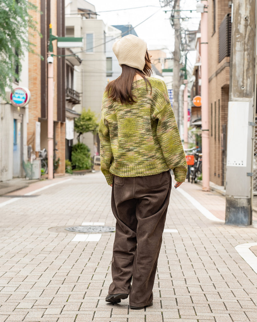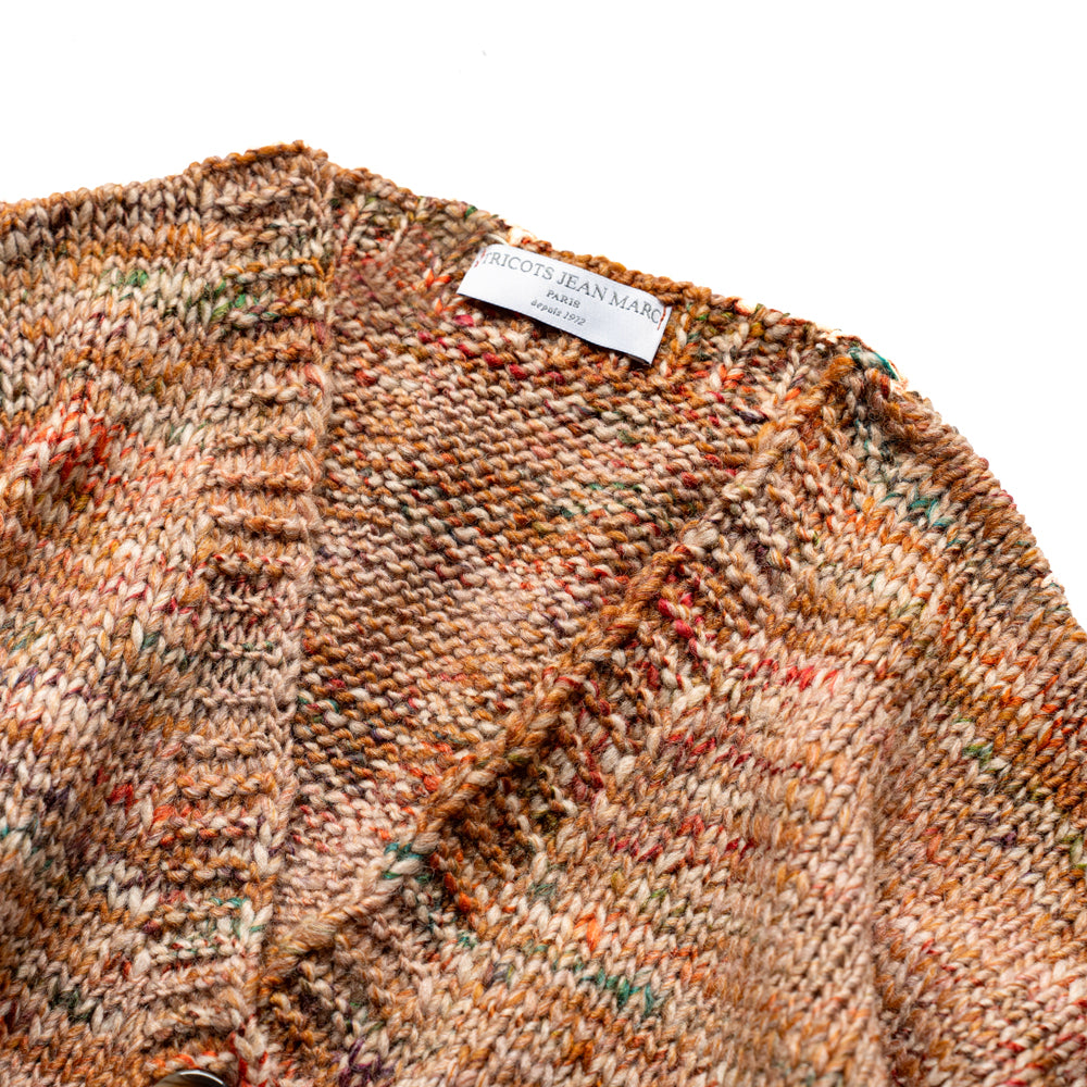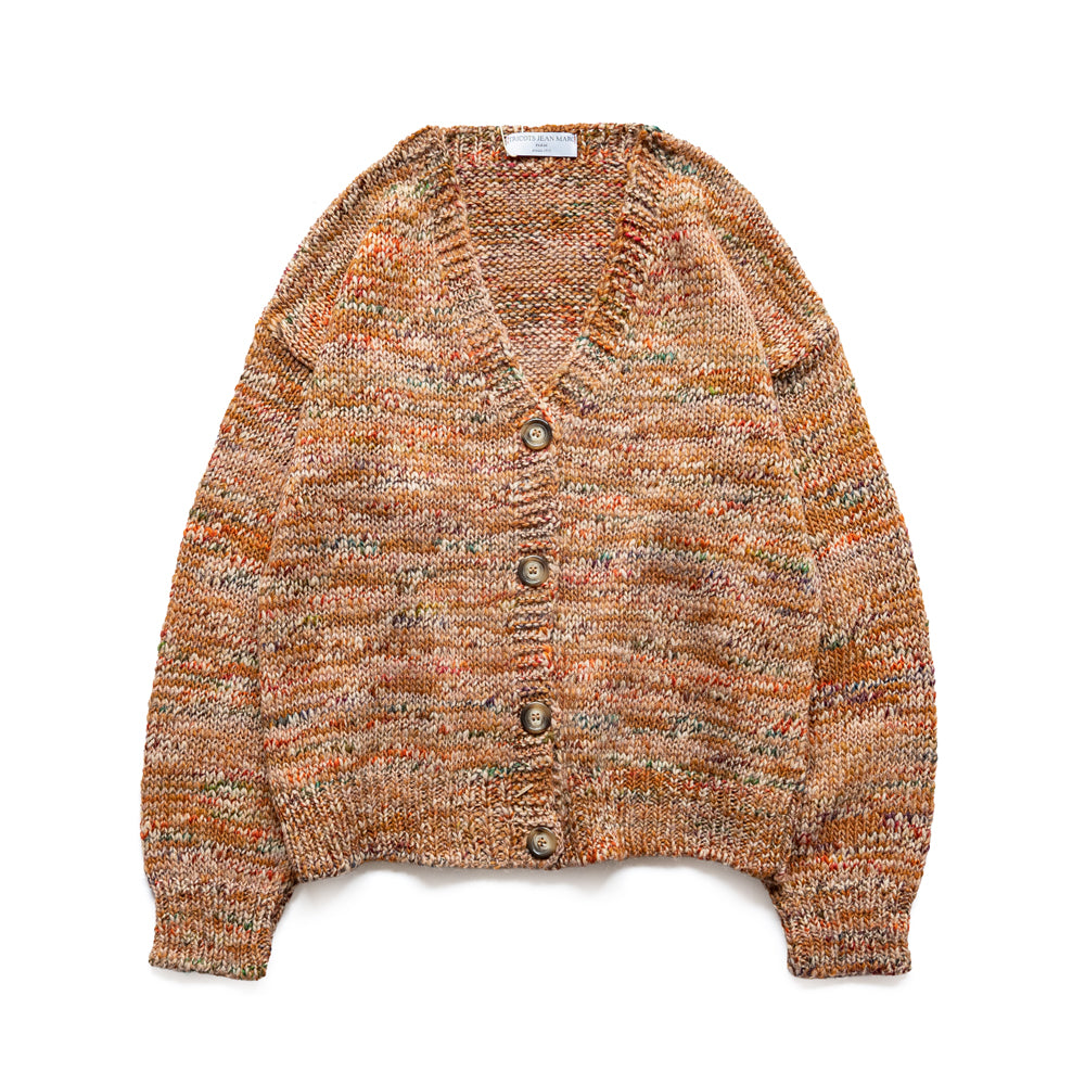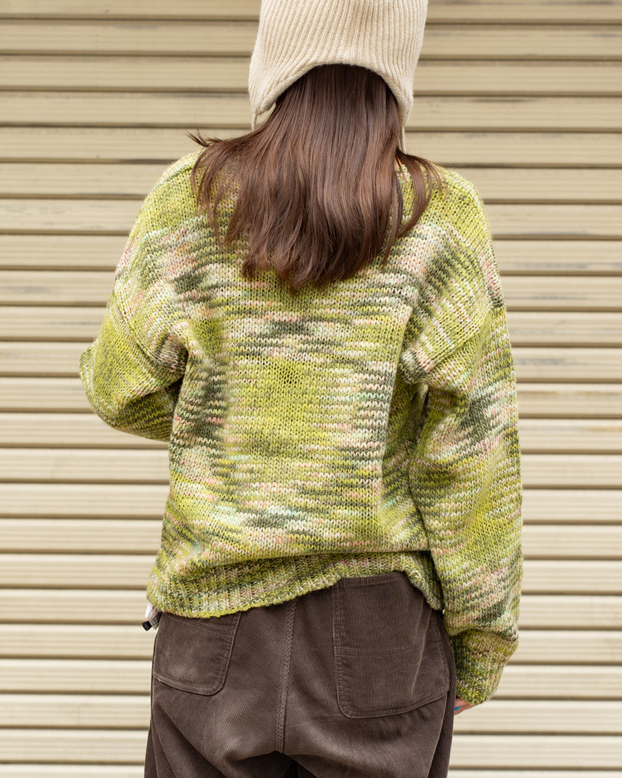 さまざまな色が混ざり合ったざっくり編みのカーディガン。程よくゆとりのあるサイズ感です。見た目よりも軽やかな着心地で羽織りやすいです。リラックス感のあるシルエットでさまざまなボトムと合わせやすいと思います。