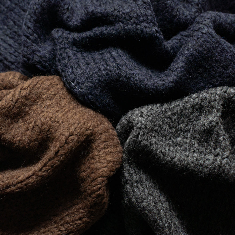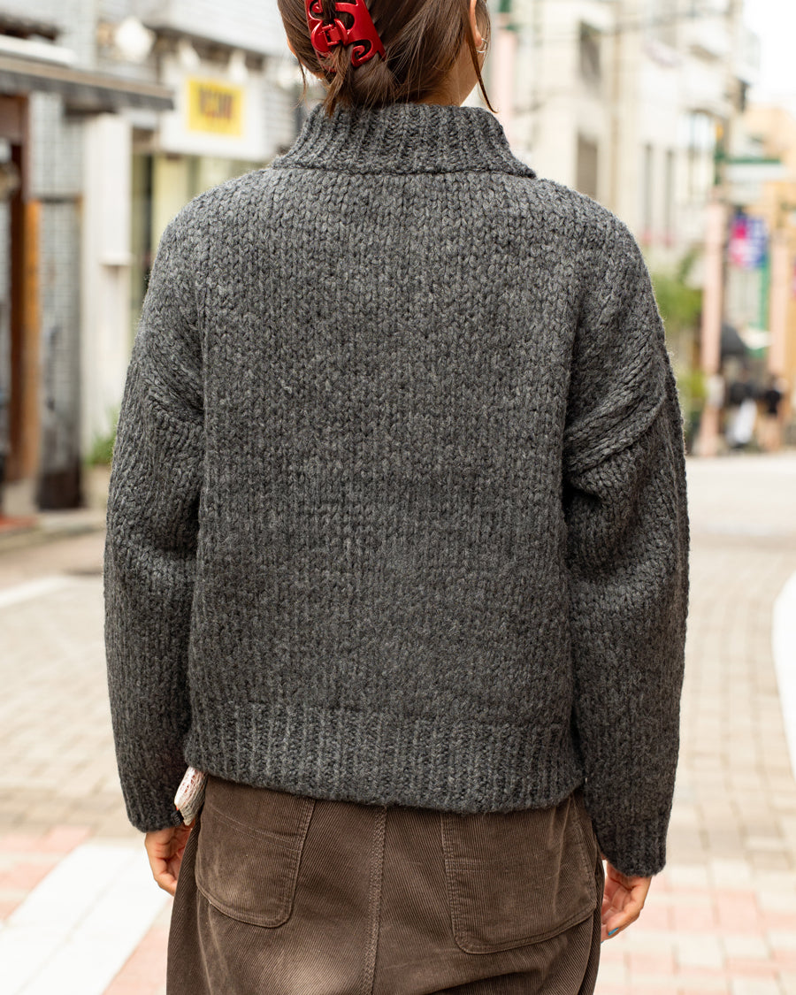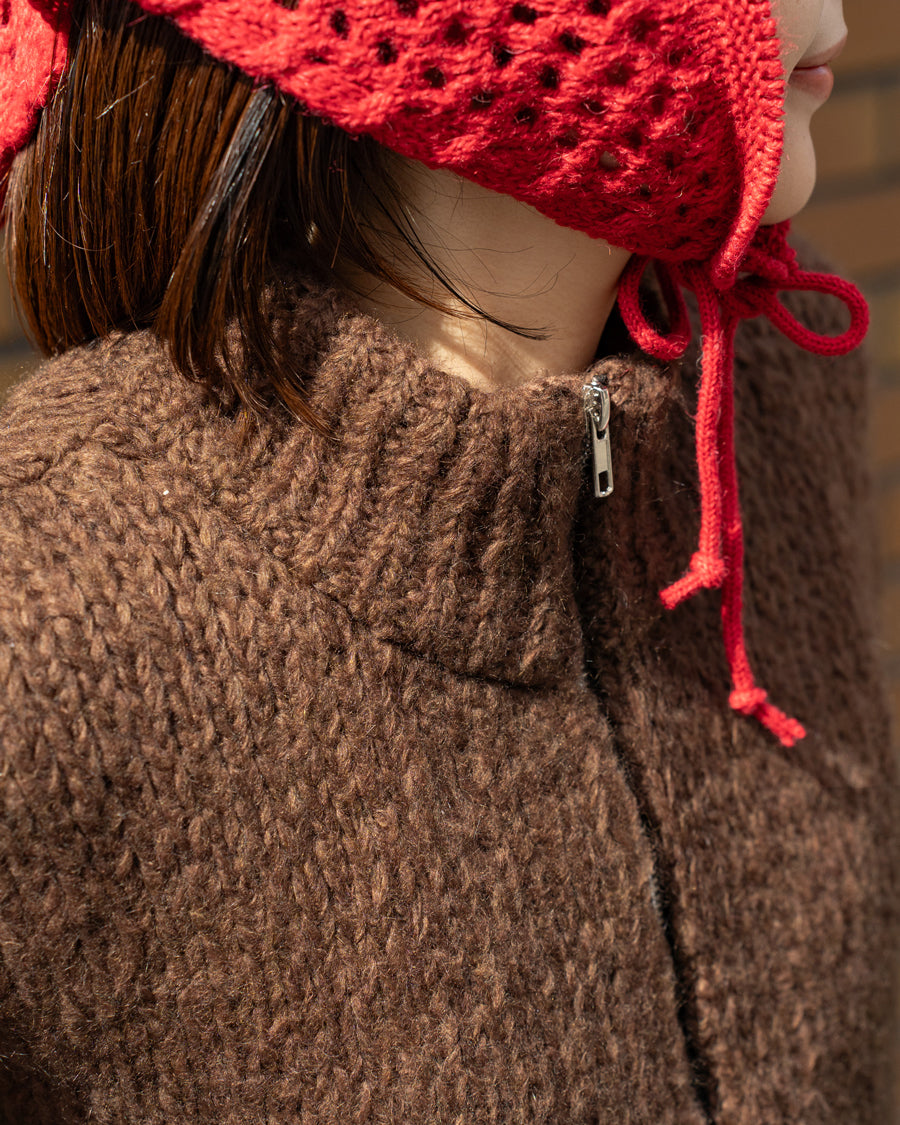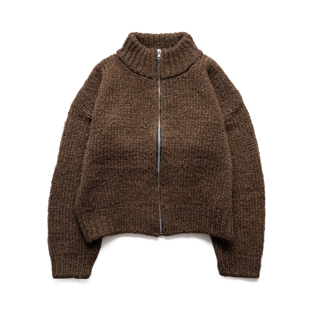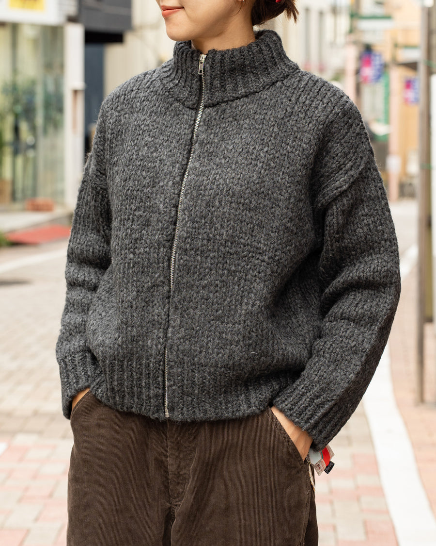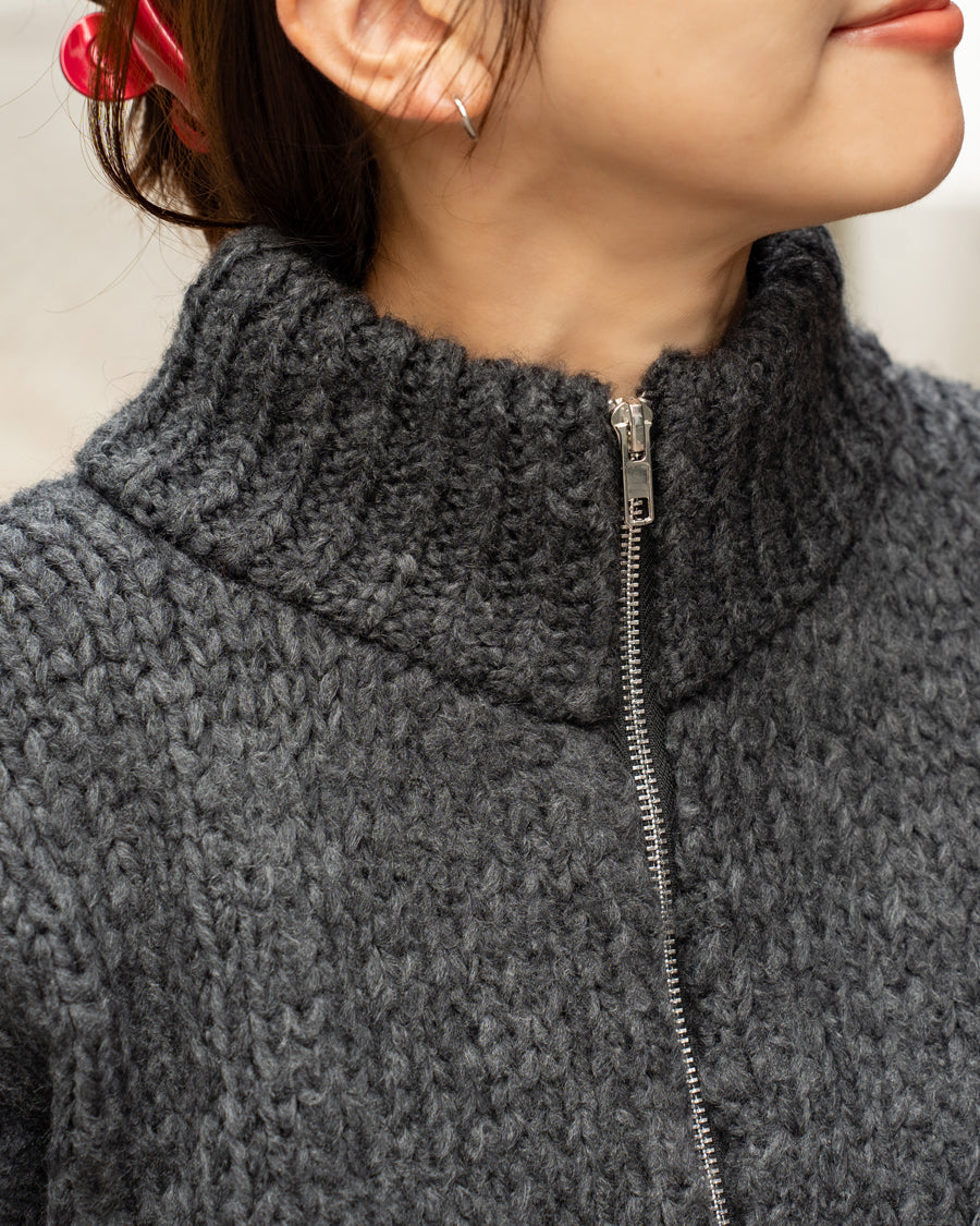 ざっくり編みのジップブルゾン。ふんわりとした風合いでとても軽やかな着心地でありながら保温性も高いです。フロントはシングルジップでハイネックデザイン。ネックは厚みがあるので首周りを温めてくれます。シンプルなデザインで着回しのきくアイテムです。